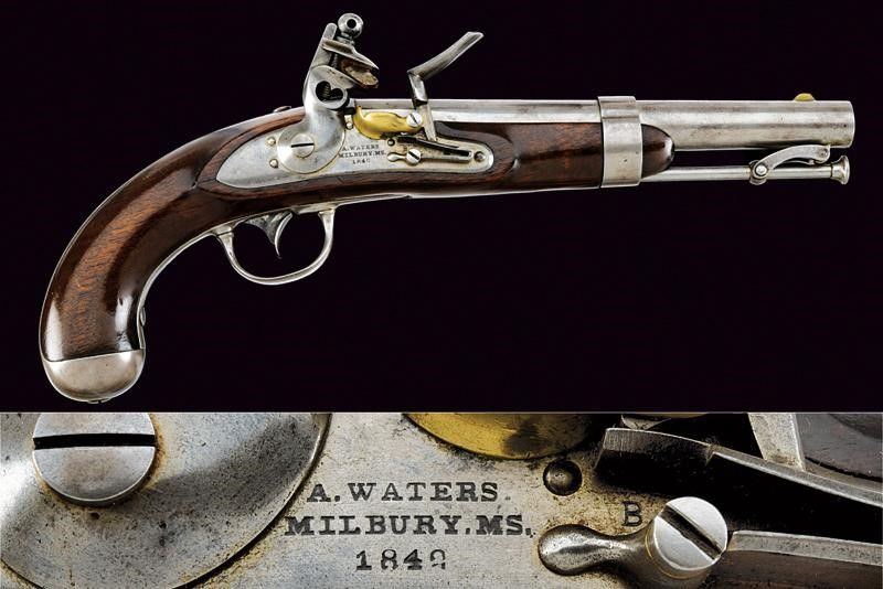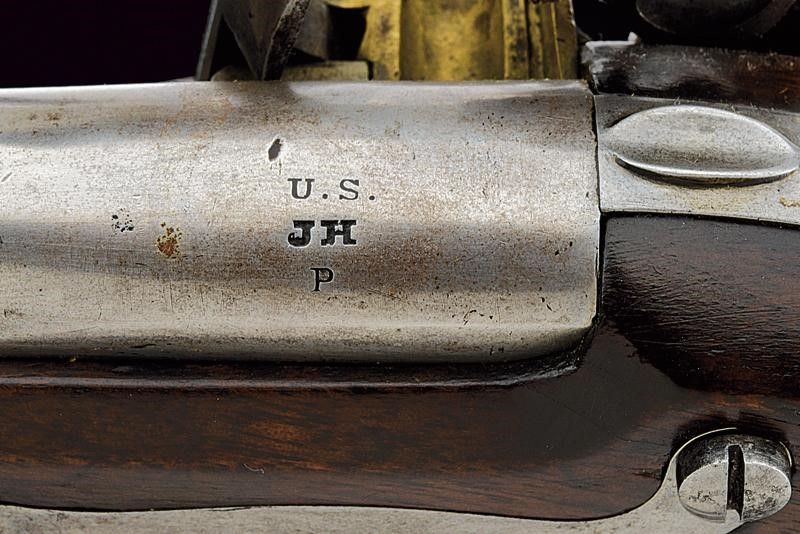 USA, lunghezza 35 cm. 1842 Canna tonda liscia con culatta punzonata 'US / JH / P'. In volata cal. 54. lunga 8-1/2'. Mirino in ottone, codolo con traguardo a sella. Batteria marcata 'A.WATERS / MILBURY MS' e con data '1842'. Punzone 'B'. L'interno della cartella con resti di finitura e vari punzoni. Meccanica ben funzionante. Cassa a tre quarti in legno con timbri d'ispezione militare sul fianco sinistro. Fornimenti in ferro. Bacchetta a snodo.
