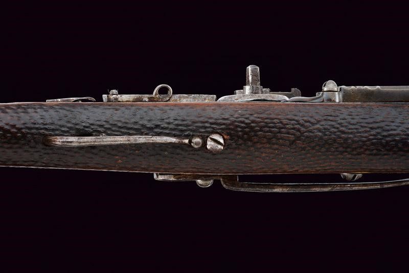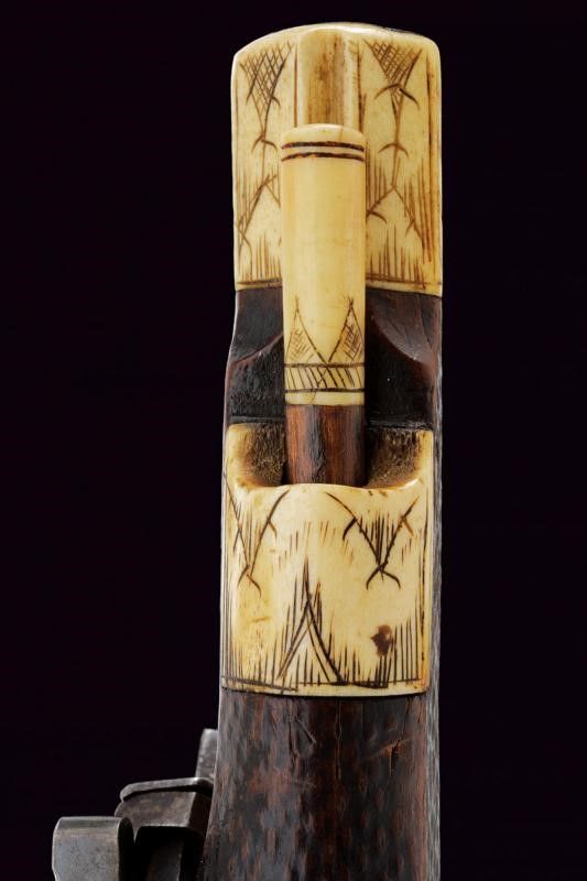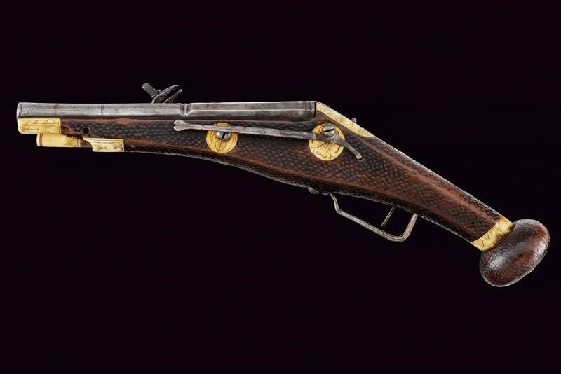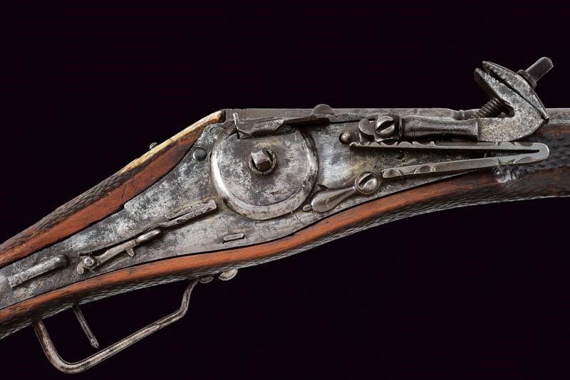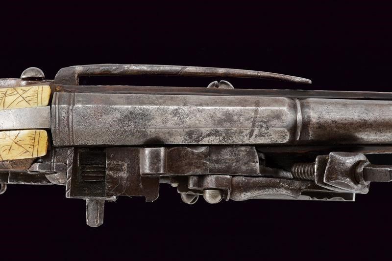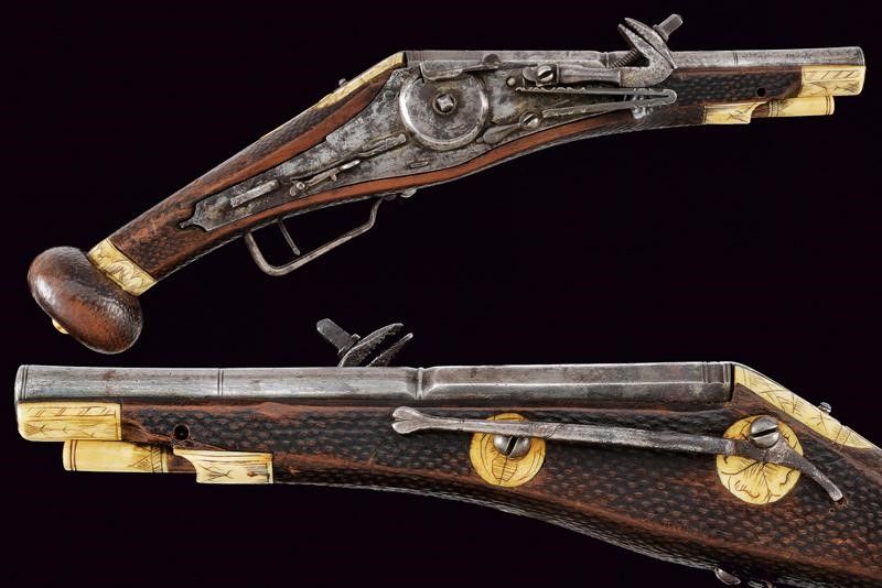 lunghezza 42 cm. Canna liscia a due ordini, prima ottagonale e con cornice alla base, poi tonda e con anellatura al cambio; la volata con delineature, cal. 10.5 mm. Codetta liscia angolata. Batteria arcaica a ruota esterna, con molle intagliate, munita di sicura e copriscodellino a scatto; zone con danni da ruggine. Cassa intera in legno decorata sul tipo dei puffer da truppa degli elettori di Sassonia, Cristiano I e II. Tarsie in osso incise a motivi floreali e geometrici. Il pomo di forma sferoide schiacciata ai poli. Ponticello e gancio da cintura in ferro. Manca la spina reggicanna anteriore. Bacchetta in legno con battipalla in osso.