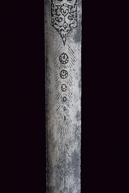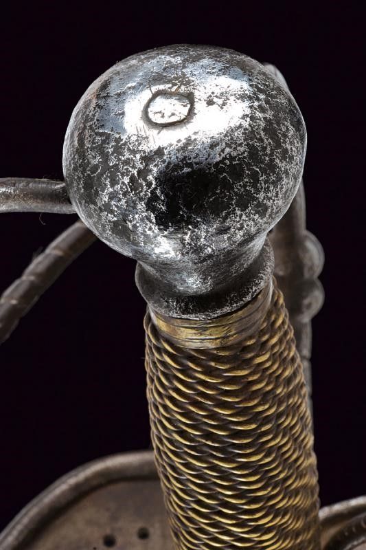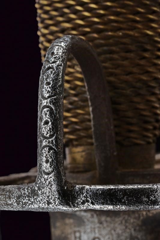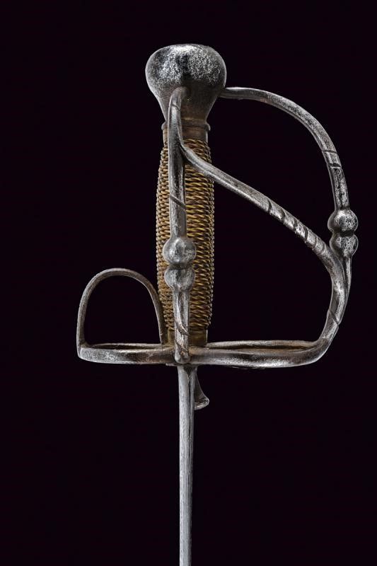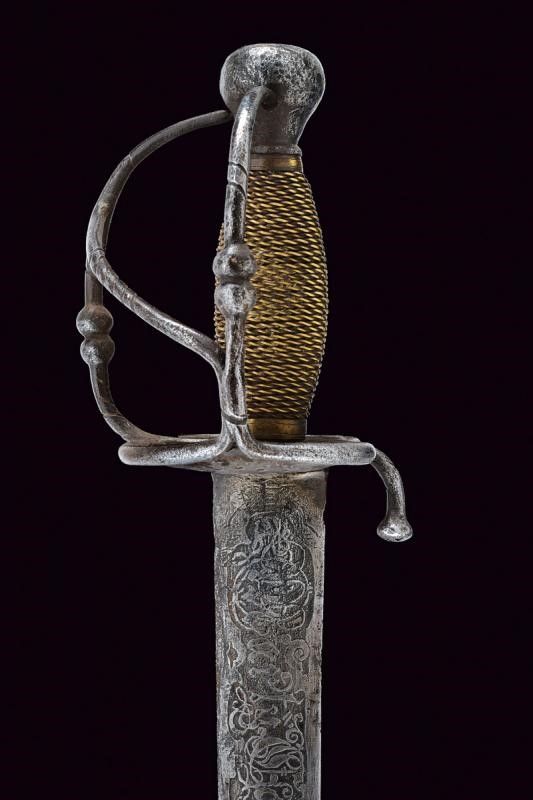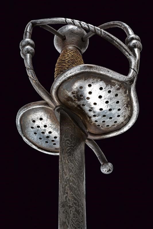 lunghezza 94.5 cm. Lama dritta a due fili, di sezione lenticolare, recante nella prima parte sul lato di terza l'iscrizione e la data 'Marty (?) Carol Brandenberg 1632' su fondo nero e con cornice a motivi floreali; il lato di quarta con stemma alla base, sul bordo iscrizione 'GAULLIEUR', il resto inciso a trofei, motivi geometrici e floreali. Tipico fornimento in ferro a doppia valva traforata, rami di guardia decorati a doppi nodi, anello da pollice. Varie piccole decorazioni. Pomo liscio a vaso ed impugnatura in legno rivestita con trecciola in filo d'ottone.