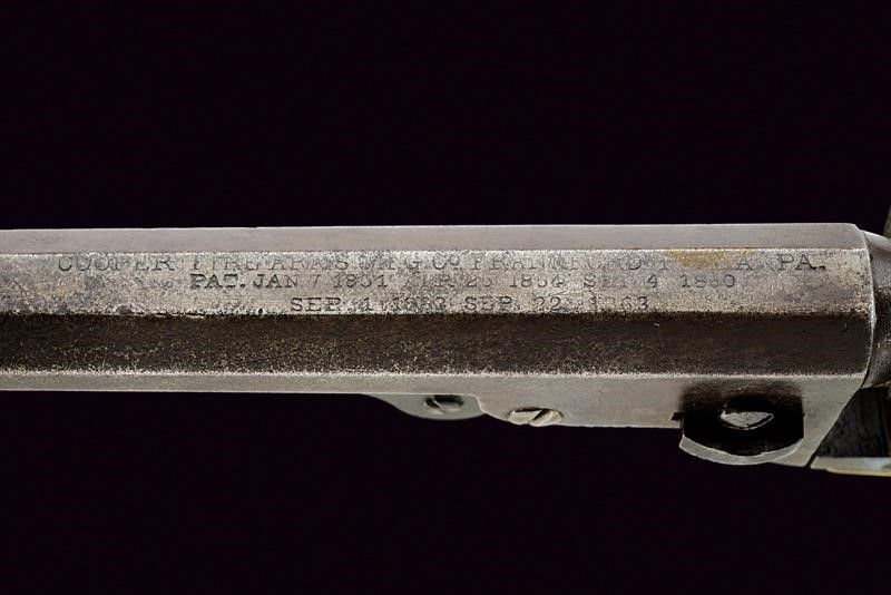 USA, lunghezza 27,7 cm. 1864 Canna ottagonale rigata da 6', con mirino a cuspide in ottone e resti di marcatura della ditta al dorso con brevetti, cal. 36. Anima da pulire, con incrostazioni, rigatura visibile. Tamburo a cinque colpi, con coda ribassata. Meccanica funzionante. Impugnatura in noce. Bande in ottone, sul fondo la matricola '6x'. Qualche intaccatura. Leva del calcatoio in due segmenti. Non comune.