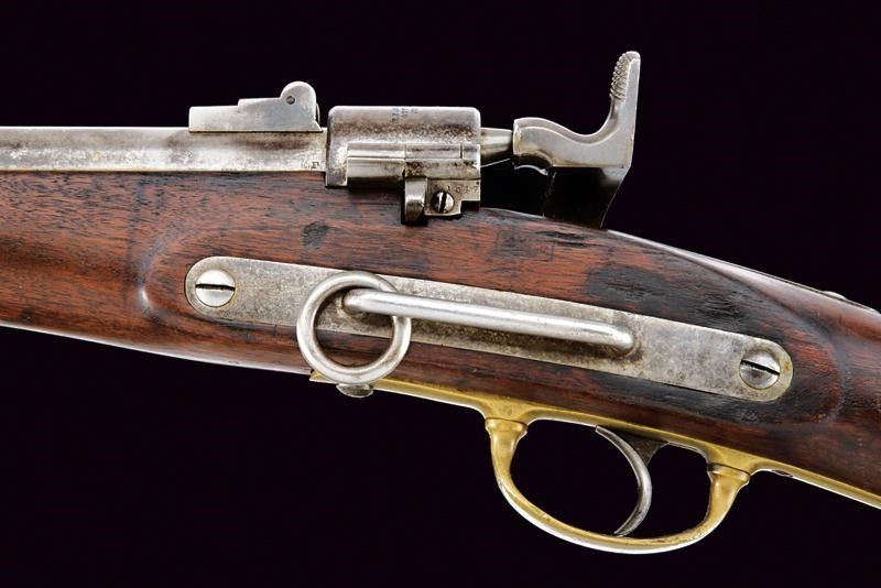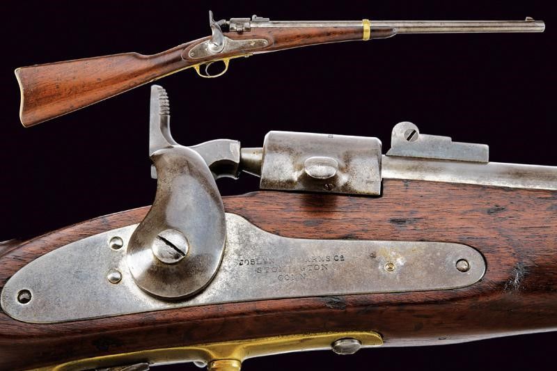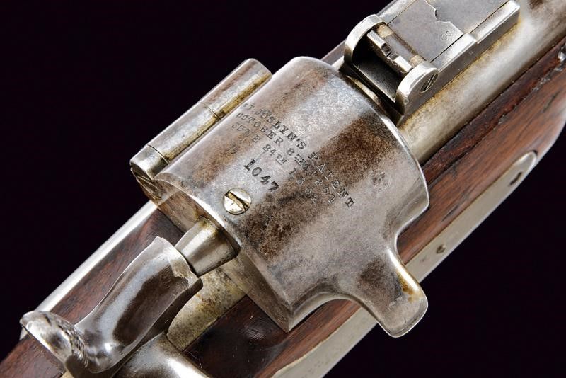 1860 circa Canna tonda rigata da 22', dotata di mirino, munita di alzo regolabile a tre altezze, a fogliette abbattibili, cal. 52 rimfire. Punzonata 'EF'. Anima pulita, rigatura visibile, lievi intaccature e segni d'uso. Otturatore ribaltabile con marcature al dorso dei brevetti del 1861-1862, recante matr. '10xx'. Batteria a molla in avanti marcata 'JOSLYN FIRE ARMS C.o STONINGTON CONN.' Meccanica funzionante. Mezza cassa in noce con timbro d'ispezione militare sul lato sinistro vicino all'otturatore. Contropiastra in ferro con anello da sella. Fornimenti in ottone. Superficie esterna dei metalli in buono stato.