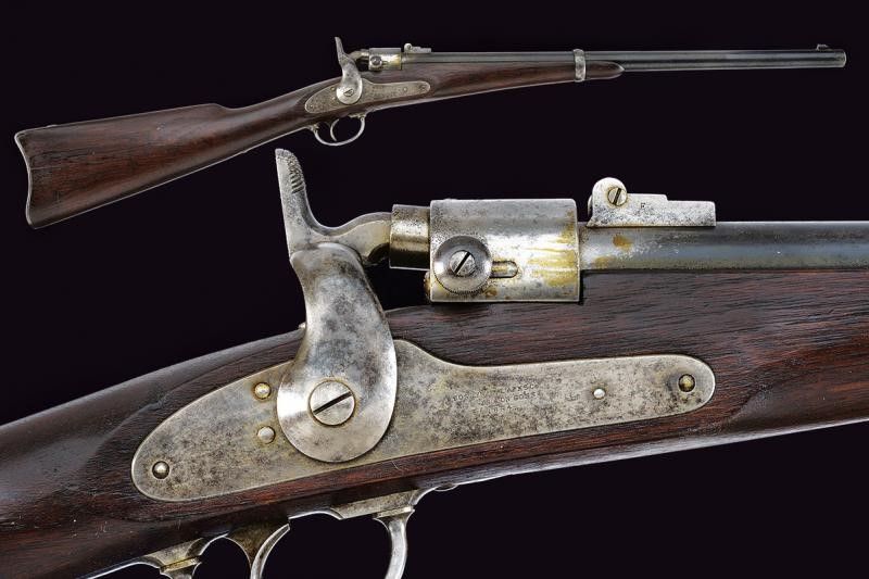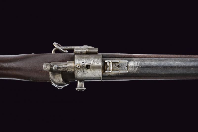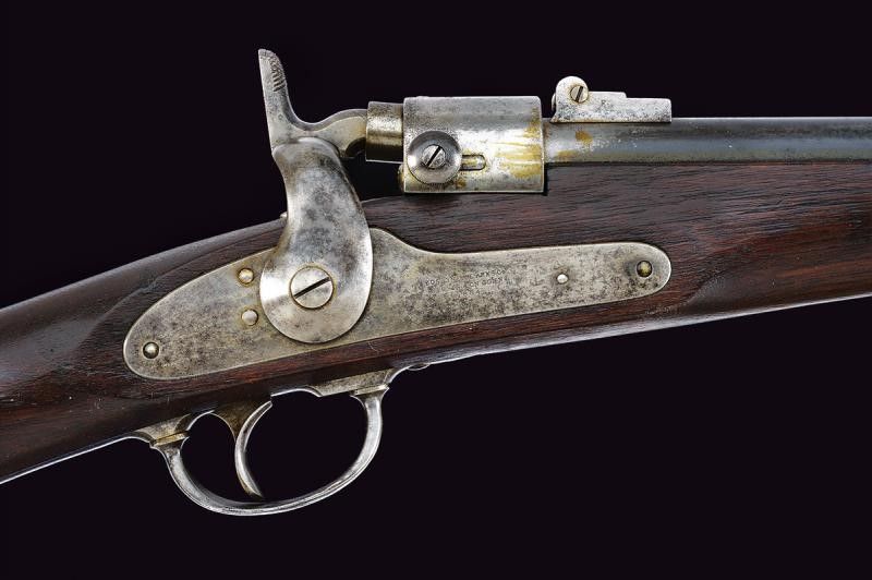 1864 Canna tonda rigata da 22', dotata di mirino, munita di alzo punzonato 'E' regolabile a tre altezze, a singola foglietta abbattibile, cal. 52 rimfire. Anima pulita, rigatura visibile, lievi intaccature e segni d'uso. Otturatore ribaltabile, con marcature sul retro dei brevetti del 1861-1862, recante matr. '10xxx'. Batteria a molla in avanti marcata e datata 'JOSLYN FIRE ARMS C.o STONINGTON CONN. 1864'. Meccanica funzionante. Mezza cassa in noce con due timbri d'ispezione militare sul lato sinistro accanto alla contropiastra, questa in ferro con anello da sella. Fornimenti in ferro, calciolo marcato 'US'. Qualche intaccatura, resti di brunitura (vecchia?) alla canna.