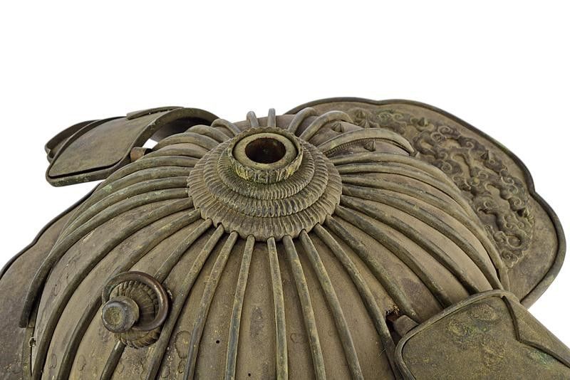 altezza 14 cm. Periodo Edo (1603-1867) Hachi con 28 piastre Nerikawa (cuoio bollito). Hachimanza alla sommità. Kasajirushi-no-kan sul retro. Mabizashi con un fornimento in metallo decorativo a motivi di nuvole fissato con quattro rivetti. Fukigaeshi in due pezzi con “Mitsu-uroko-mon” (stemma della famiglia Hojo). In patina, da pulire.