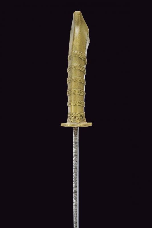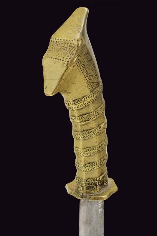 Mindanao, lunghezza 54.5 cm. XIX Secolo Lama dritta a un filo, di forma crescente verso la punta, con dorso decorato ad intagli geometrici, alla punta anche intagli a onde. Impugnatura di tipica foggia, completamente in ottone, decorata a bande e con incisioni geometriche. Fodero in legno; la parte superiore rivestita con tessuto e corde colorate, catena metallica che è parte della cintura. Il puntale decorato con quattro elementi cilindrici lavorati ad anellature (uno di ricambio). La lama e il fodero con stemma e numero di collezione. Molto raro.