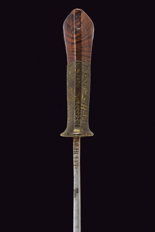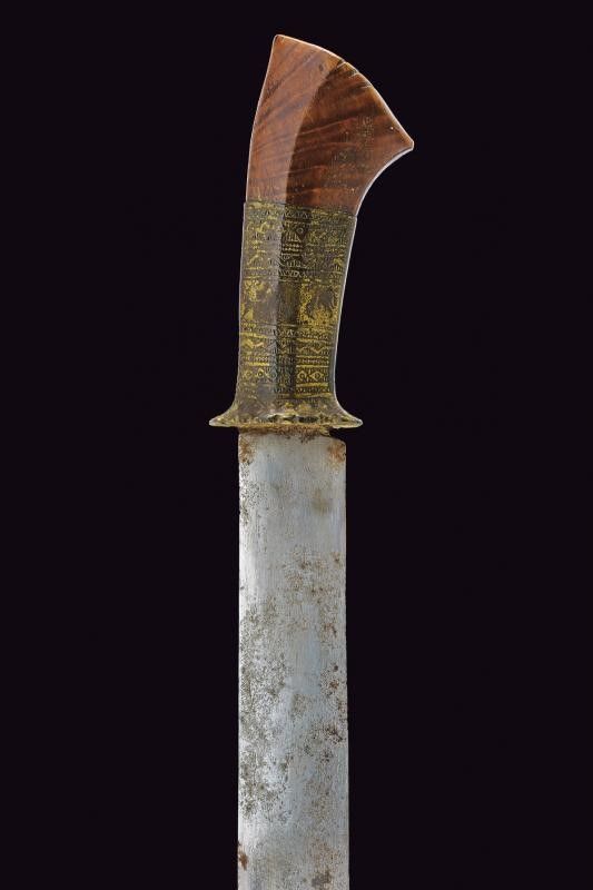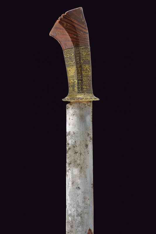 Mindanao, lunghezza 55 cm. XIX Secolo Lama dritta a un filo con punta incavata ed intagliata al dorso; zone con danni da ruggine. Impugnatura in ottone inciso a bande, con pomo in legno scolpito. Fodero in legno parzialmente scolpito e rivestito con corde, tessuto e bande in rattan. Molto raro.