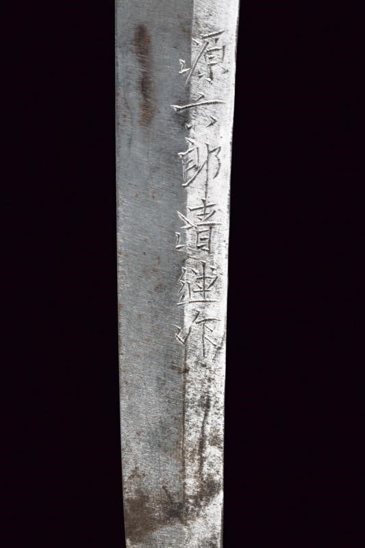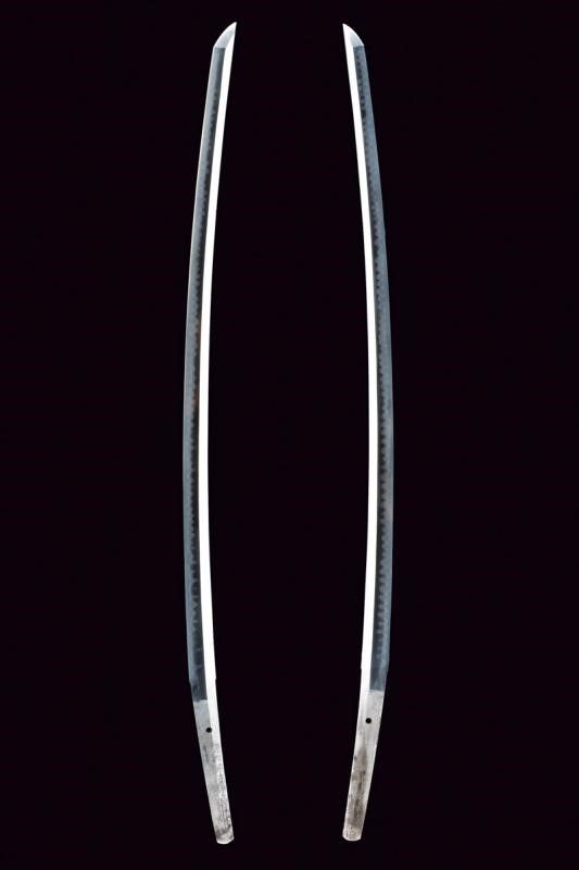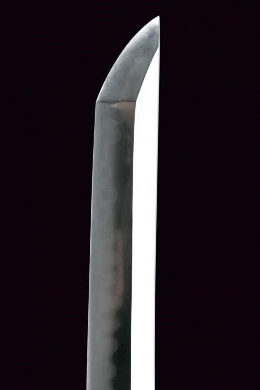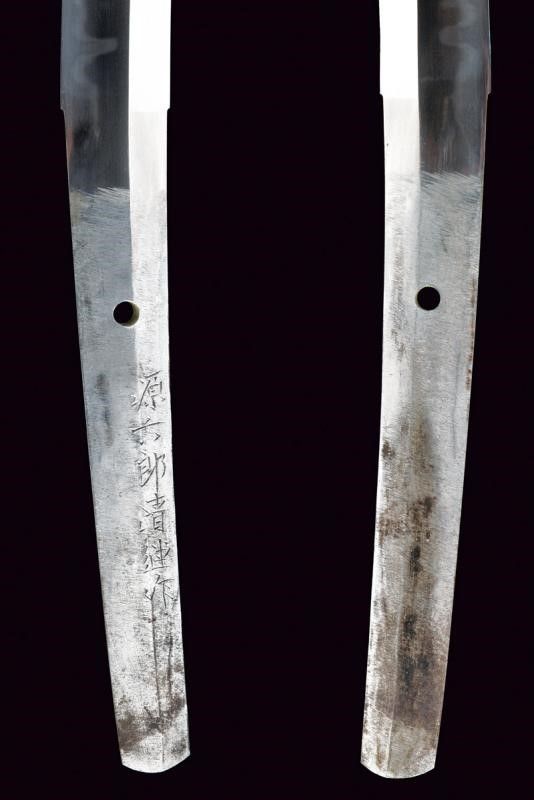 Periodo Showa (1926-1989) Lama con Nagasa di 78.5 cm; hamon: midare; hada: mokume. Nakago mei: Minamoto Kiyotsugu Saku. Habaki in rame. In shirasaya.