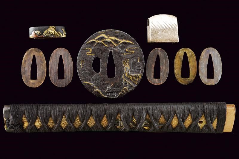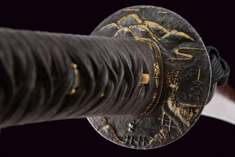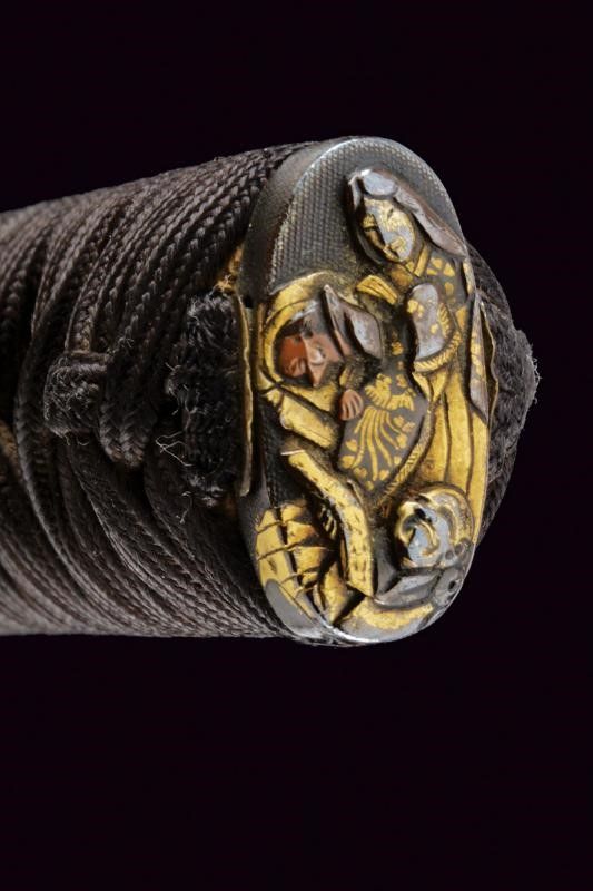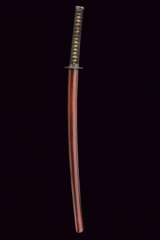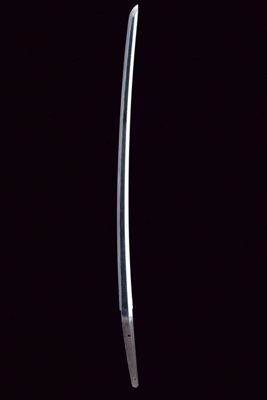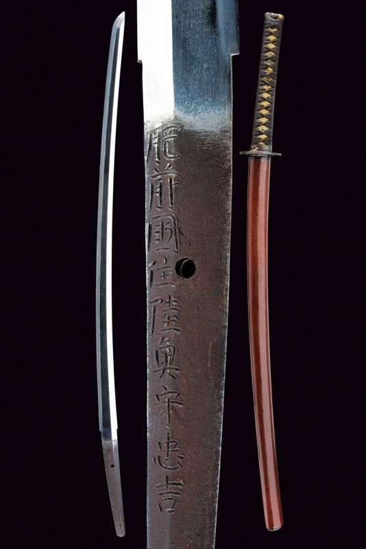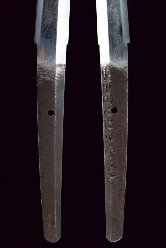 lunghezza 94 cm. Periodo Edo (1603-1867) Lama con Nagasa di 68 cm; hamon: di base chu suguha in nie deki; hada: ko-itame; boshi: ko-maru con kaeri. Nakago-mei: Hizen kuni ju Mutsu no Kami Tadayoshi, con un mekugi-ana. Habaki in argento decorato in filigrana. Bella koshirae; la suba tate-maru-gata di scuola Jakushi, mei: Mitsuhiro, decorata con con paesaggio cinese in oro; fuchi-kashira decorati en suite con personaggi e fenice, menuki in shibuichi e oro a motivo di insegne di comando. Tsuka-ito in seta nera. Saya in lacca color rosso con fornimenti in corno nero.