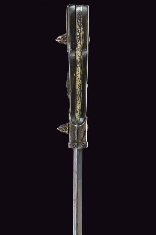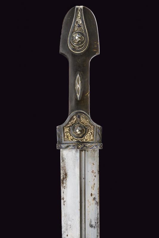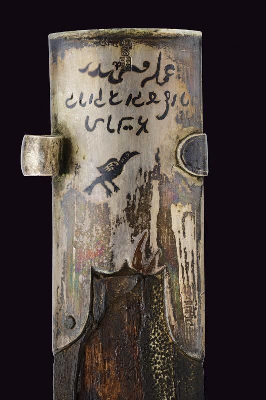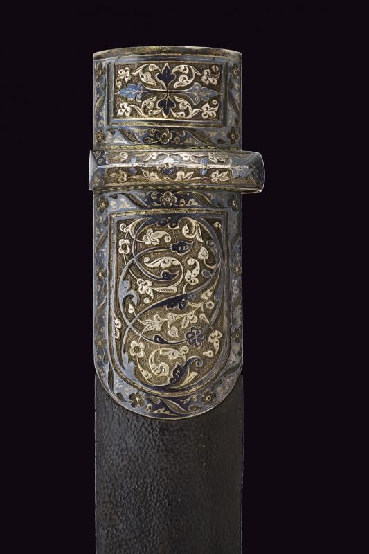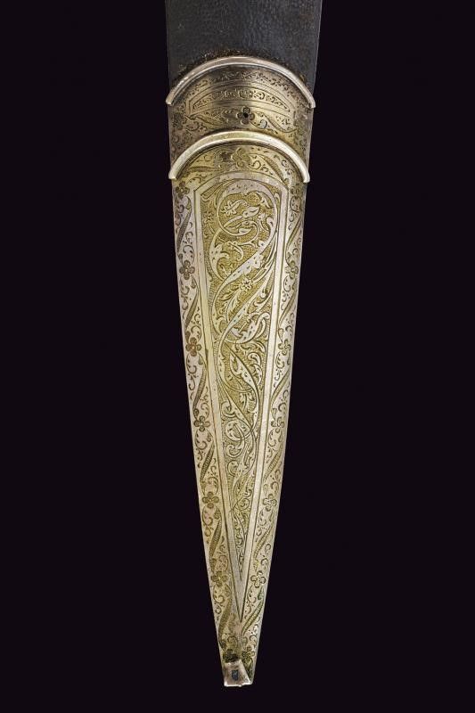 lunghezza 49 cm. Fine del XIX Secolo Lama a due fili, fortemente acuminata, con tipici sgusci paralleli ma asimmetrici. Qualche intaccatura. Impugnatura con guancette in corno bruno ben conservato. Fornimenti in argento decorati a motivi floreali in rilievo e con parti niellate. Due borchiette cuspidate. Fodero in legno antico con rivestimento in pelle (mancanze sul retro) e fornimenti in argento. Il puntale solamente inciso a racemi e piegato sul fondo. La cappa en suite con l'elso, dotata di passante e con il retro liscio recante iscrizione in caratteri arabi ed effige di un uccello niellato.