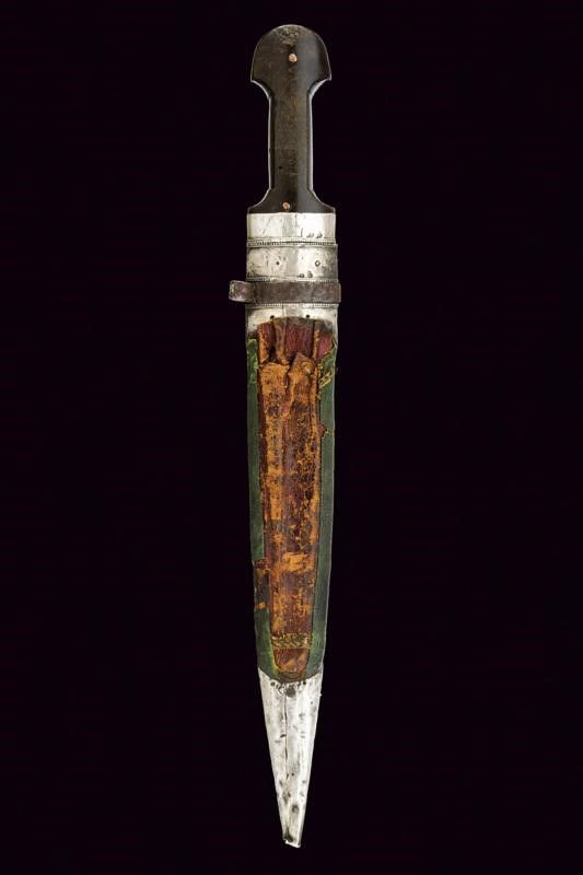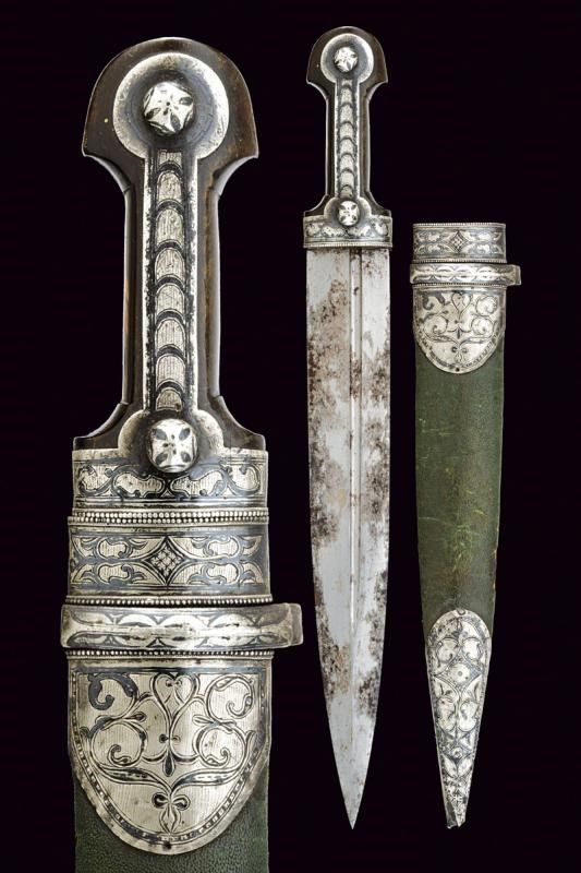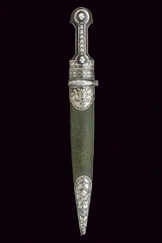 lunghezza 49.5 cm. Fine del XIX Secolo Robusta e larga lama dritta a due fili con scanalature parallele ma asimmetriche. Impugnatura in corno con fornimenti in argento inciso e niellato e con due punzoni in caratteri cirillici. Fodero (piccole mancanze e difetti) in legno, rivestito di cuoio verde con fornimenti in argento decorati e punzonati en suite, la parte posteriore con piccola guaina in cuoio per un coltello.