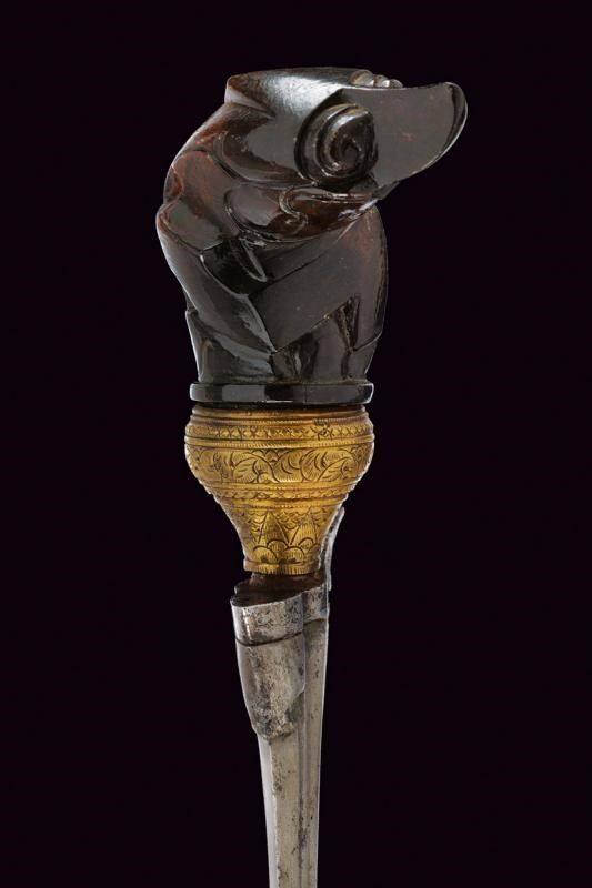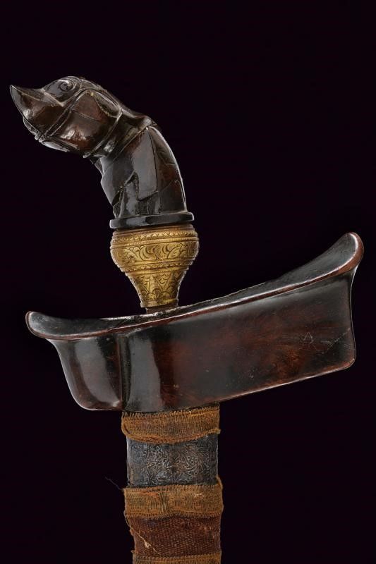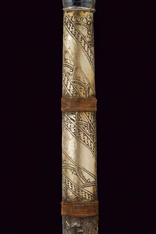 Sumatra, lunghezza 43 cm. XIX Secolo Lama dritta a due fili lisci con scanalature a tutta la lunghezza, la base intagliata. Ukiran in legno scolpito. Selut in ottone finemente inciso. Wrangka in legno con gandar completamente rivestito in due tipi di lamina d'argento (piccoli danni e mancanze) incisa a motivi floreali e geometrici e tenuta da bande in canutiglia e tessuto antico.