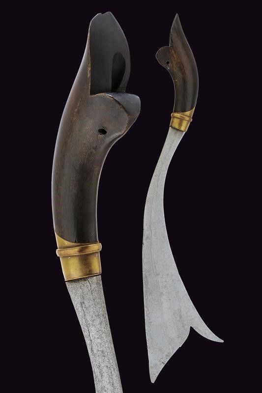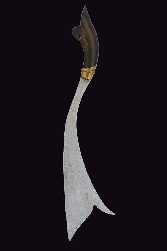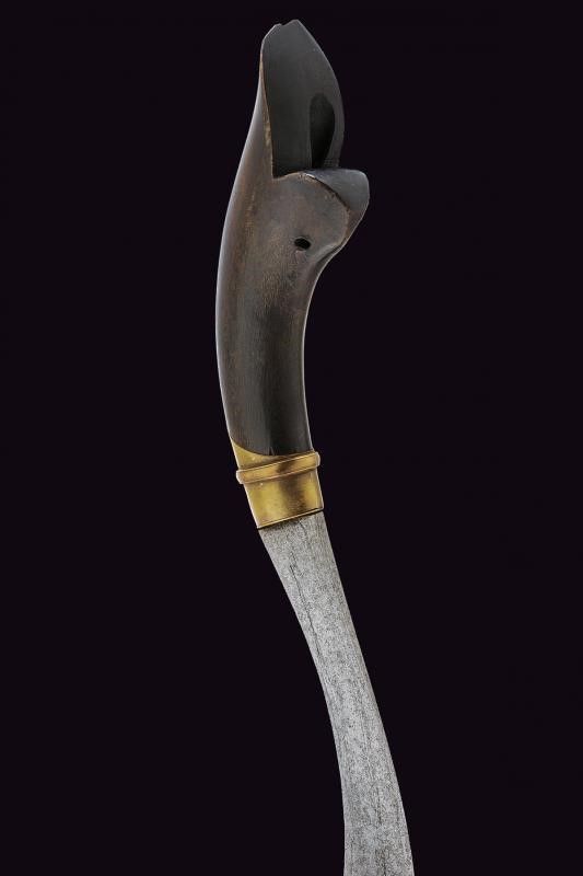 XVIII/XIX Secolo Bella lama curva, fortemente crescente verso la duplice punta, a un filo, in fine pamor. Impugnatura in corno scolpito, con ghiera in ottone.
