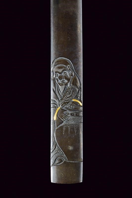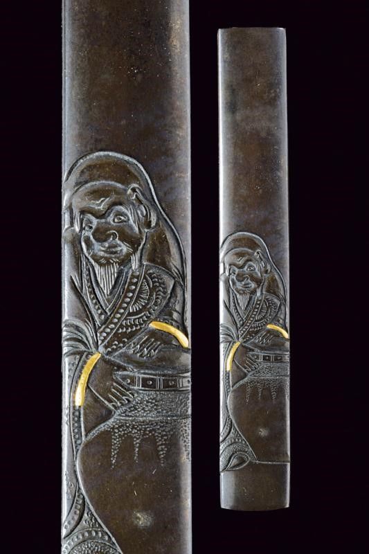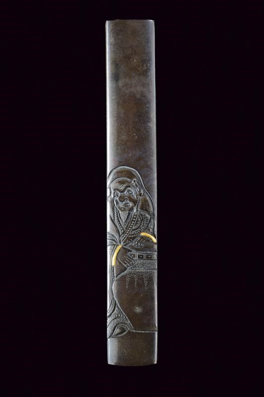 Periodo Edo (1603-1867) Ornato ad intaglio con effige di un personaggio con un grande vaso, alcuni elementi arricchiti con doratura kinzogan.