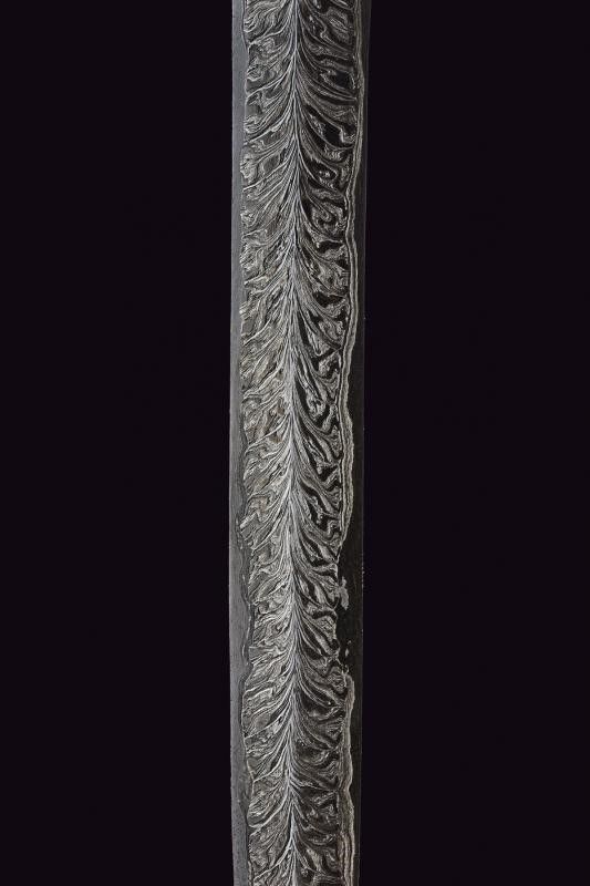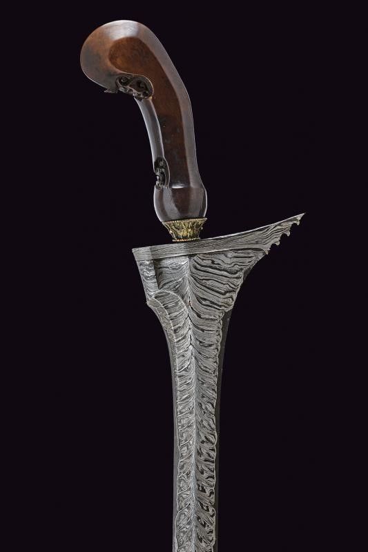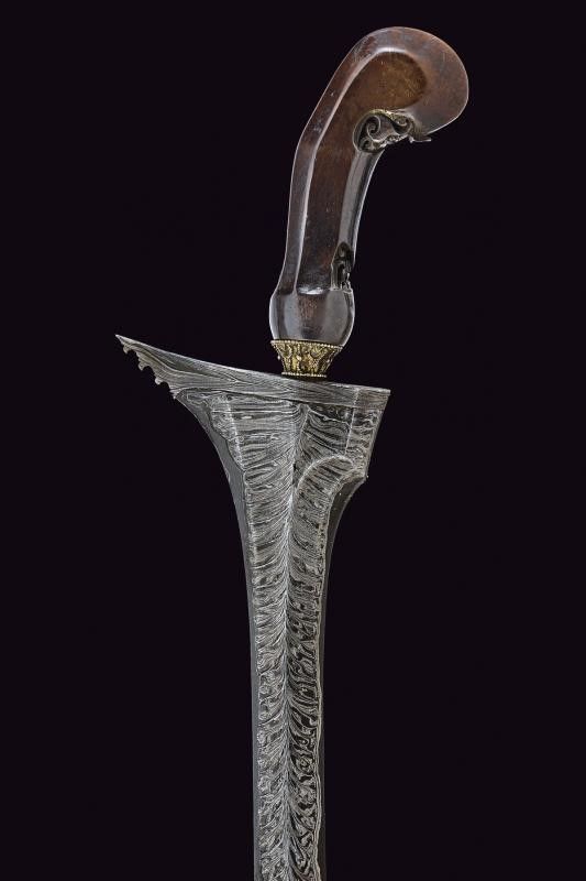 Surakarta, lunghezza 45.5 cm. XIX Secolo Lama dritta a due fili, in fine pamor con bellissima fantasia. Ukiran in legno con doppio patra. Semplice mendak in rame con decorazioni in filigrana. Wrangka in legno, gandar in legno con pendok in lamina di ottone incisa a motivi floreali.