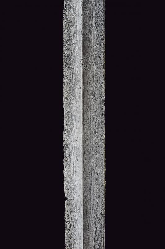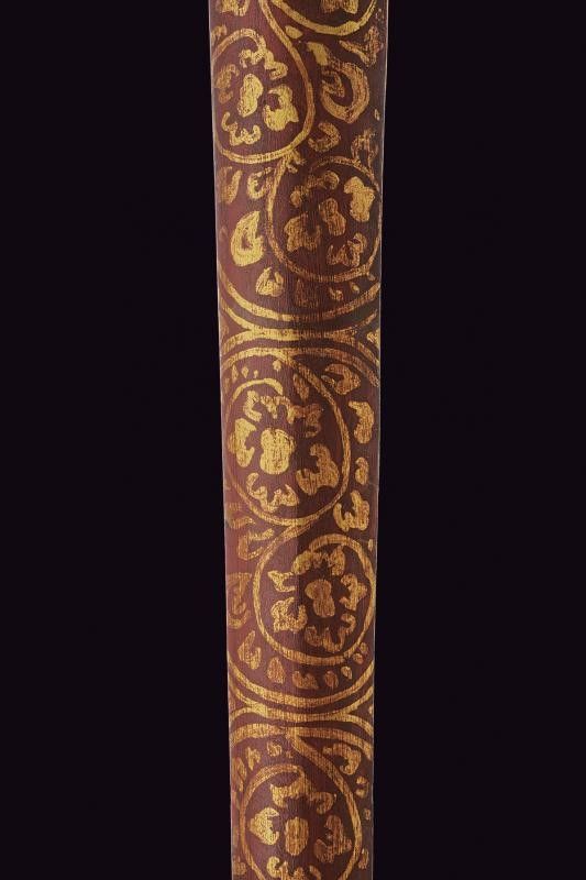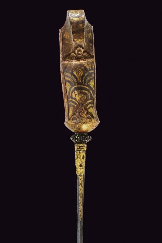 Bali, lunghezza 63.5 cm. XIX Secolo Lunga lama dritta a due fili, in pamor (piccole intaccature), nervata centralmente, con punta rinforzata; la base con due profonde scanalature e riccamente decorata in oro come anche il ganja; su un lato effige di un animale sacro a tuttotondo e dorato. Ukiran in legno scolpito e dipinto in oro e rosso a motivi floreali. Mendak in ottone con pietre nere a cabochon. Wrangka in legno scolpito con un mascherone in rilievo a motivi floreali; il retro dipinto a testa di drago. Gandar parzialmente scolpito e riccamente dipinto, recante due figure in oro e in policromia, la parte posteriore a motivi floreali in oro su fondo rosso.