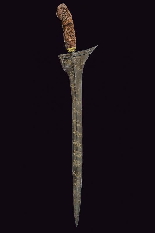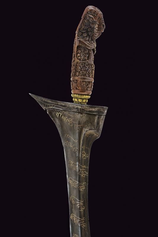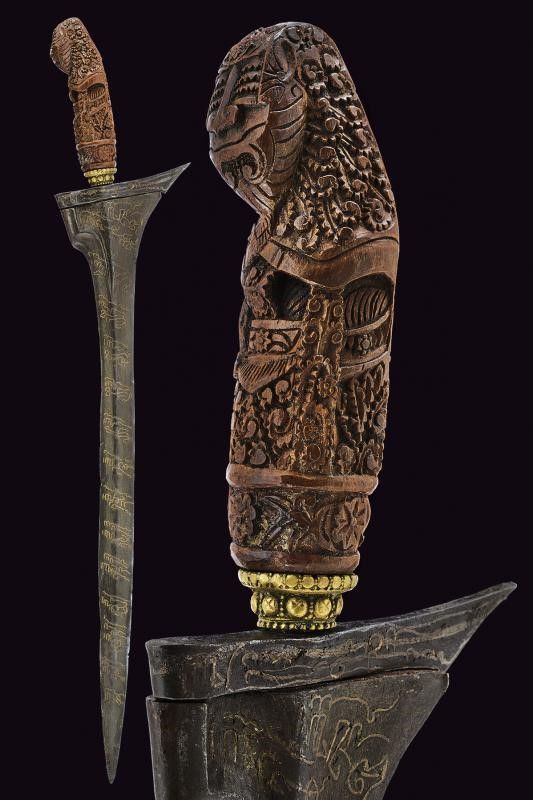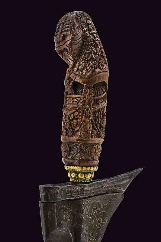 Madura, lunghezza 51 cm. XVII / XIX Secolo Lama dritta del XVII secolo, a due fili, con scanalatura alla base, con iscrizioni in caratteri arabi ageminate in ottone (probabilmente inserite in epoca successiva), presenti anche al ganja. Bell'ukiran in legno riccamente scolpito con un'effige sacra e a motivi floreali. Mendak in ottone. Privo di fodero.