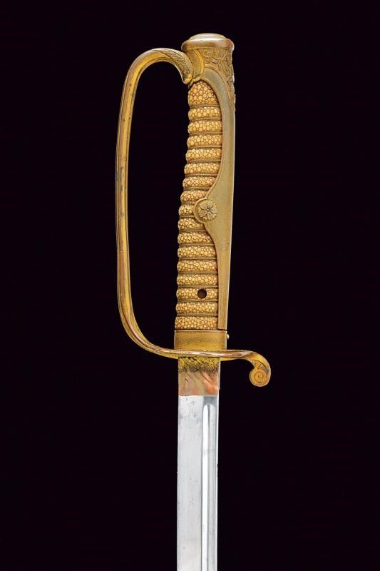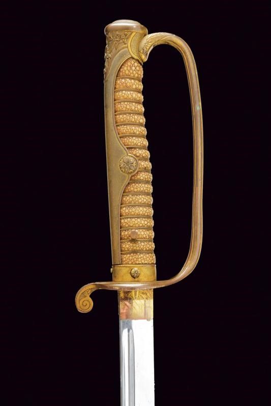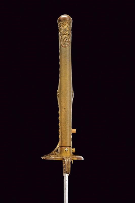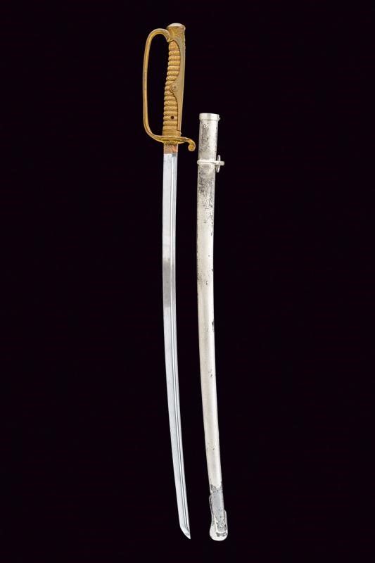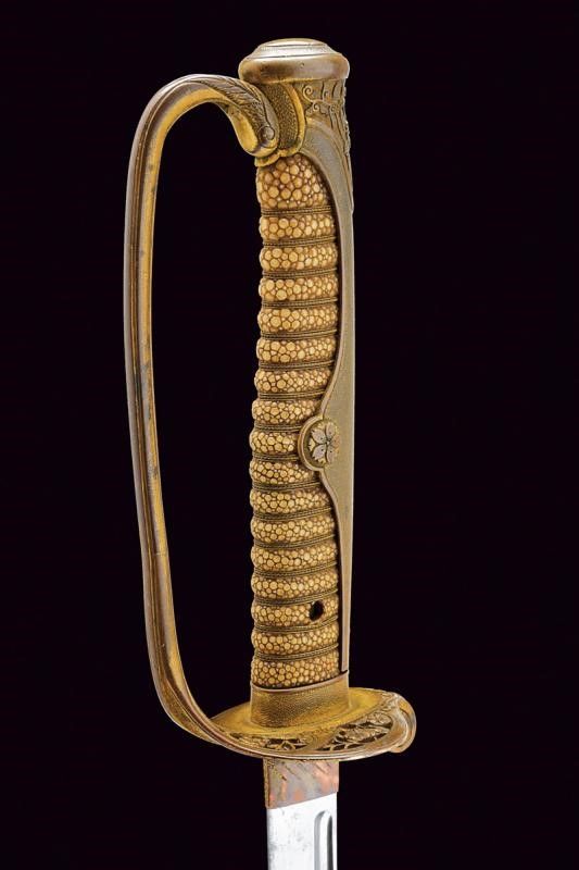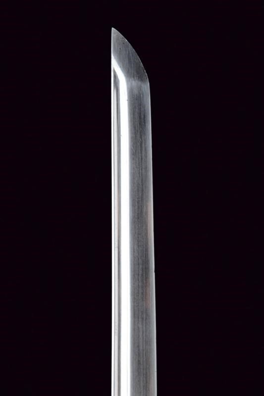 lunghezza 94.5 cm. primo quarto del XX Sec. Lama leggermente curva a un filo con profonda scanalatura dorsale. Habaki in rame con resti di doratura. Fornimento in ottone dorato, parzialmente traforato e decorato a motivi floreali; impugnatura rivestita con pelle di razza e munita di trecciola metallica. Fodero in ferro nichelato (mancanze alla finitura) ad una campanella e con chiusura a bottone (non funzionante).