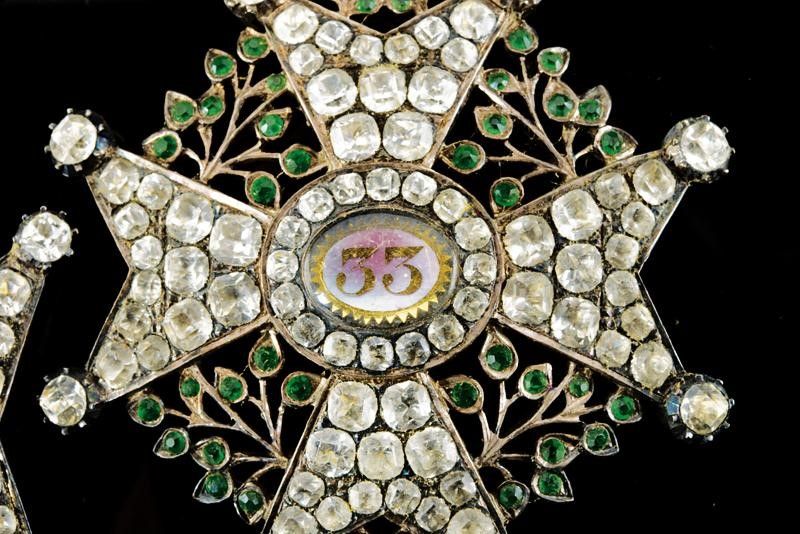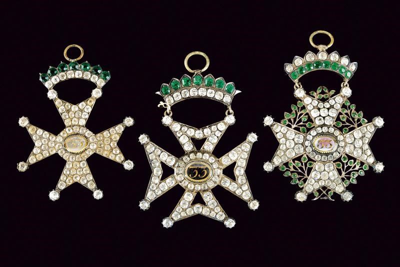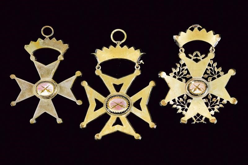 altezza 7 - 7.6 - 7.6 cm. XIX Secolo Tre croci in metallo giallo decorate con simil-pietre, di tre diverse classi, quella piů piccola con corona fissa, le altre due classi con corona movibile, tutte con numero '33' al centro e con spade incrociate nel medaglione posteriore.