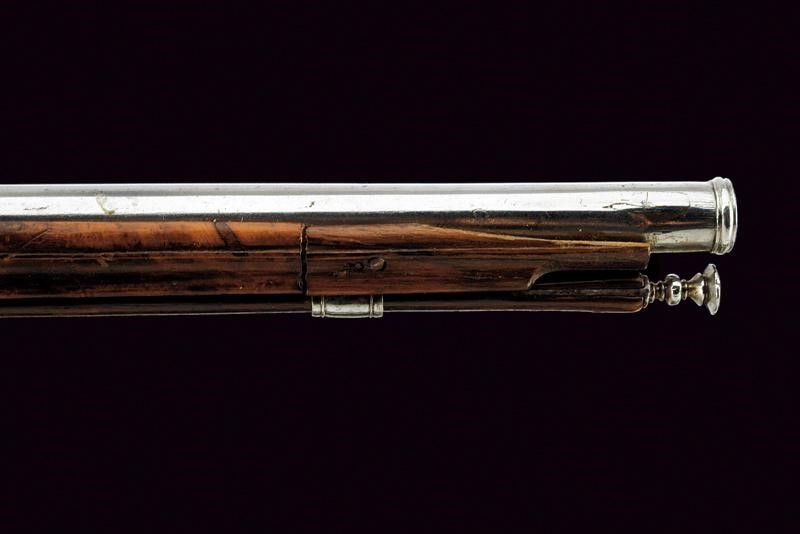 lunghezza 95 cm. Canna liscia a due ordini, quadra alla camera di scoppio con duplici delineature ai lati e tonda con tre cornicette scanalate, gioia di bocca in volata e cornicetta scanalata alla codetta. Reca incisa in stampatello tra trifogli la firma ' Lazarino Cominazzo'. Bella batteria con cartella leggermente bombata e incisa con un tralcio, magistralmente intagliata con mascherone e volute terminanti a teste di drago. Cassa intera in radica di noce (fessurata sotto la batteria) e con antico restauro al terminale del fusto. Tutti i fornimenti in ferro intagliati in bassorilevo con maestria nel tipico stile bresciano della metà del seicento. Reca alla contropiastra il gancio da cintura munito di occhio tondo. Bacchetta originale in legno con cavastracci e battipalla in ferro.
