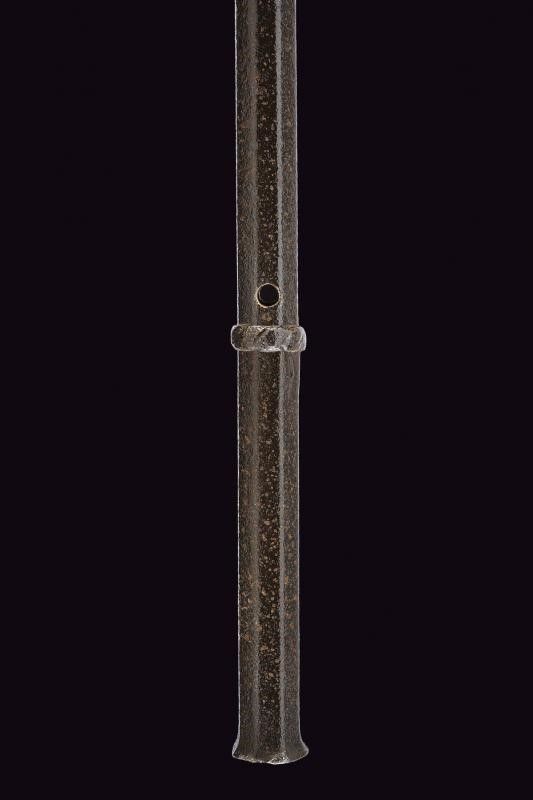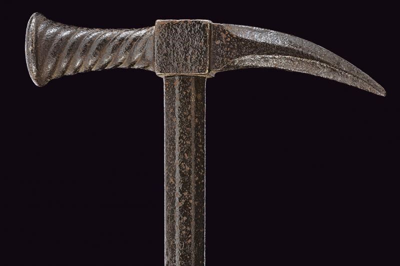 lunghezza 51 cm. Completamente in ferro, con testa dotata di robusta penna faccettata e leggermente incurvata verso il basso, il martello di forma circolare con collo decrescente a spire, il massello quadrato. Fusto faccettato, l'impugnatura con anellatura nella parte superiore, leggermente strombata e cava. Foro per la cinghia.
