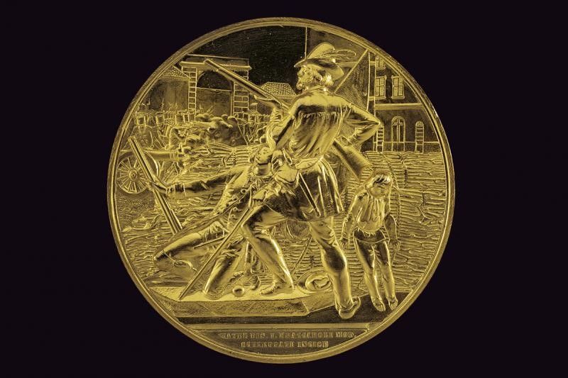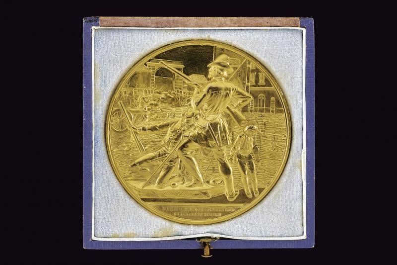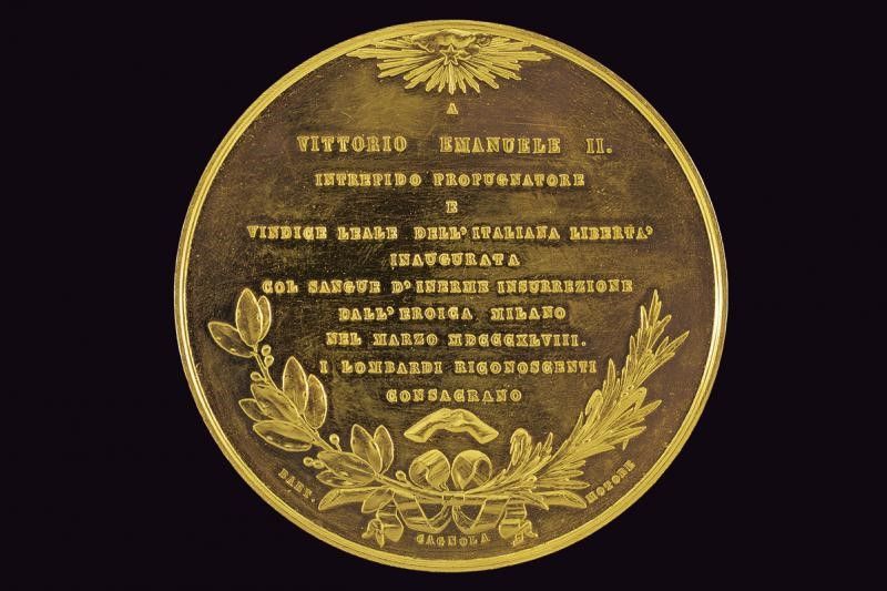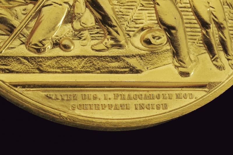 diametro 8 cm. 1848 Bellissima medaglia di grande formato in argento (bronzo?) dorato raffigurante una scena delle barricate in bassorilievo. Marcatura in basso 'F. HAYEZ DIS. I. FRACCAROLI MOD. L. SCHIEPPATI INCISE'. Sul retro iscrizione e sotto 'BART. GAGNOLA MOTORE'. Nel suo astuccio originale.
