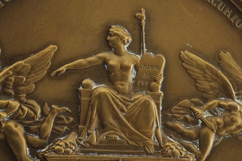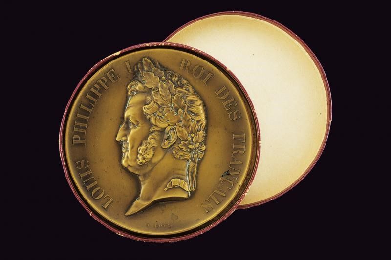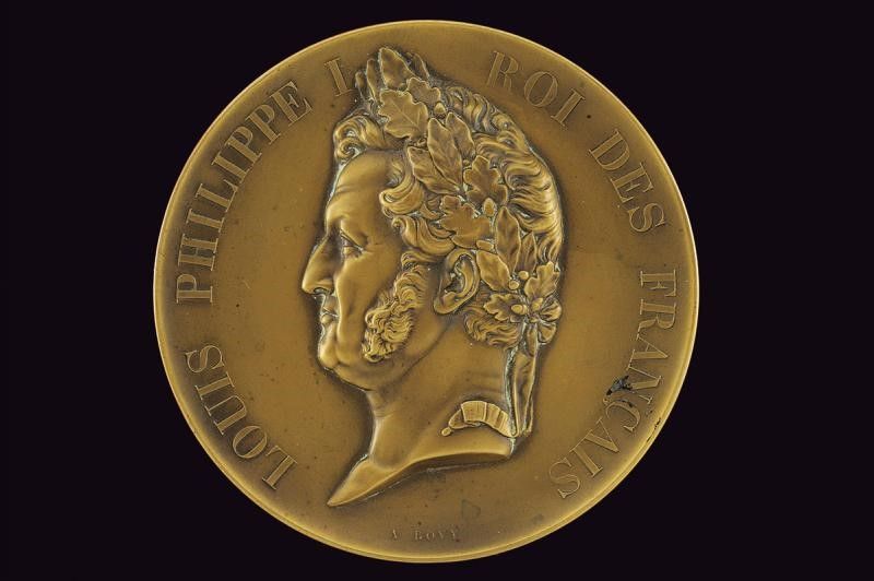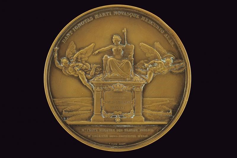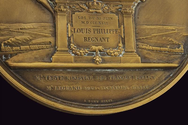 diametro 11.2 cm. 1842 Medaglia in bronzo di grande modulo coniata per celebrare la legge sulle ferrovie. Al dritto busto verso sinistra del re, al bordo 'LOUIS PHILIPPE I ROI DES FRANCAIS'; opus 'A. BOVY'. Al rovescio tra tre allegorie le scritte 'DANT IGNOTAS MARTI NOVASQUE MERCURIO ALAS. / LOI DU XI JUIN M.D.CCC.XLII. LUOIS PHILIPPE REGNANT', all'esergo 'M.R TESTE MINISTRE DES TRAVAUX PUBLICS. M.R LEGRAND SOUS - SECRETAIRE D'ETAT.', opus 'A. BOVY FECIT'. Al bordo la marcatura 'BRONZE'. In astuccio di cartone.