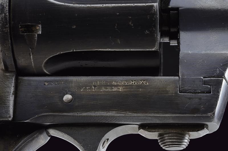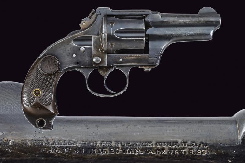 1883 circa Third Model Large Frame. Canna corta rigata, con mirino, senza bindella dorsale, cal. 44. Sul fianco sinistro resti di marcatura di Hopkins & Allen e brevetti sino al 1883. Anima pulita con leggero pitting soprattutto in volata, rigatura visibile. Tamburo scanalato a sei colpi. Castello marcato sul fianco sinistro 'CALIBRE WINCHESTER 1873' (44-40), su quello destro resti di marcatura di Merwin, Hulbert & Co. e dicitura 'POCKET ARMY'. Modello con cresta del cane pieghevole. Impugnatura a becco. Guancette in gommadura zigrinata. Matricola '9906' coeva su canna, tamburo e impugnatura. Brunitura probabilmente rinfrescata successivamente, comunque non recente. Meccanica ben funzionante sia in singola che doppia azione.
