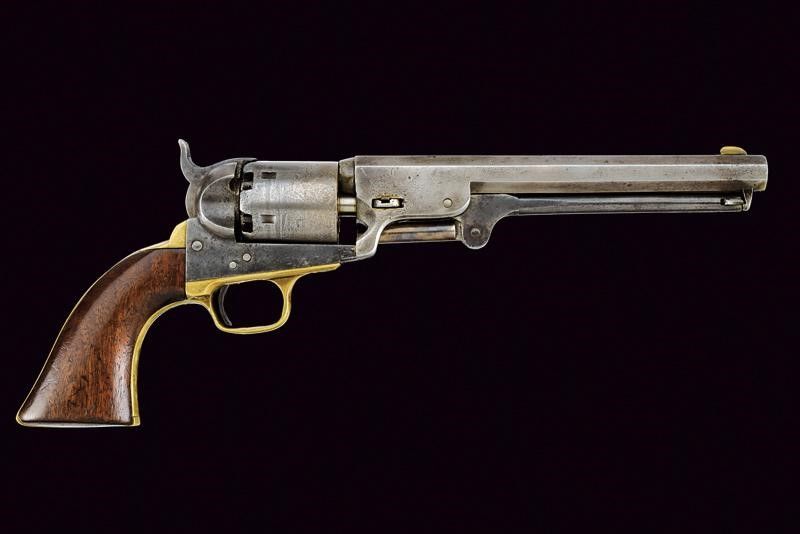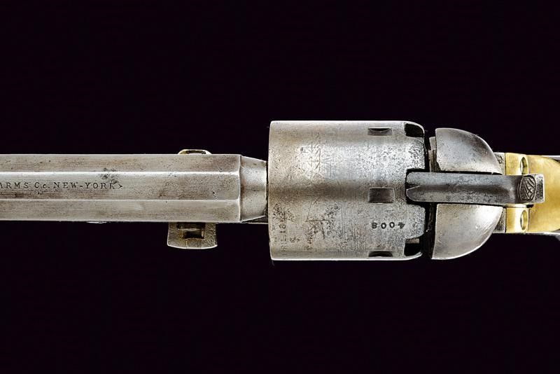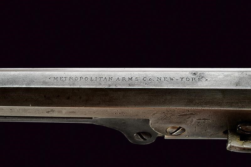 USA, lunghezza 33 cm. 1864-1866 Canna ottagonale da 7-1/3', rigata dotata di mirino a lama, con marcatura 'METROPOLITAN ARMS Co. NEW YORK', cal. 36. Rigatura visibile, anima da pulire. Tamburo a sei colpi con tracce di incisioni e resti di iscrizione '... NEW ORLEANS ...' solo parzialmente leggibile. Matricole '40xx' coeve su canna, castello, ponticello, impugnatura e tamburo. Meccanica funzionante. Bande dell'impugnatura in ottone. Crepa sul lato sinistro del castello. Impugnatura in legno. Segni d'uso e del tempo. Qualche lieve traccia di finitura antica.