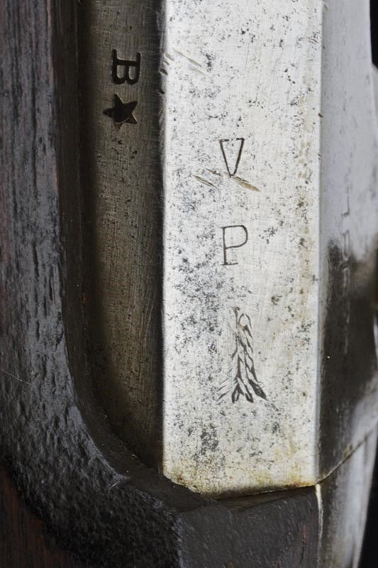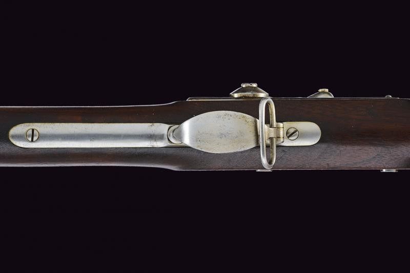 1863 Canna tonda rigata, dotata di mirino, punzonata 'B' accanto a una stella, 'P' e 'V', con testa d'aquila e datata '1863'; munita di alzo regolabile a due fogliette. Cal. 58. Rigatura visibile, anima da pulire, con diverse incrostazioni. Base del luminello del tipo Mod. 1861. Cartella datata '1863', recante marchio ad aquila e dicitura del contratto 'U.S. TRENTON'. Meccanica funzionante. Cassa intera in legno con due timbri d'ispezione militare e stampigliatura 'A.M. BURT'. Fornimenti in ferro, fascette punzonate 'U'. Calciolo marcato 'US'.