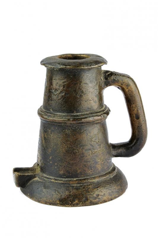 altezza 13.7 cm. Bell'esemplare con larga base munita di scodellino esterno, la canna decrescente verso la sommità e con un anellatura al centro, la volata con gioia di bocca, sul fianco una maniglia. Base tappata, ma si tratta sicuramente di un mortaio antico.