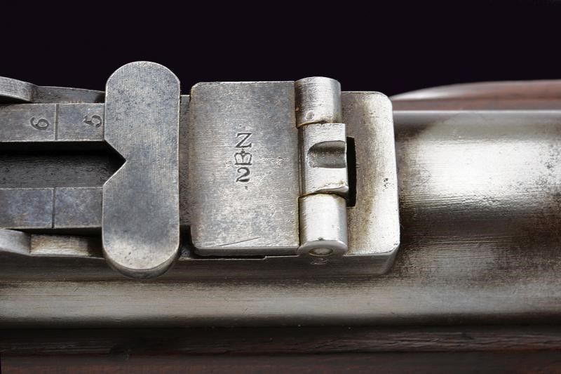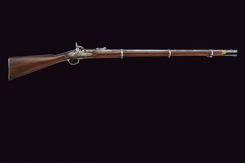 lunghezza 140 cm. Canna tonda rigata, dotata di mirino, recante punzoni britannici e marcatura della London Armoury Company 'LAC', munita di alzo abbattibile e regolabile, cal. 14,5 mm. in volata. Batteria a molla in avanti datata '1860', 'L.A.Co' e con monogramma 'VR' coronato alla codetta. Completo di fermo di sicurezza per il luminello congiunto tramite catenella al passante del ponticello. Meccanica ben funzionante. Cassa intera in noce. Fornimenti in ottone e ferro. Bacchetta in ferro.