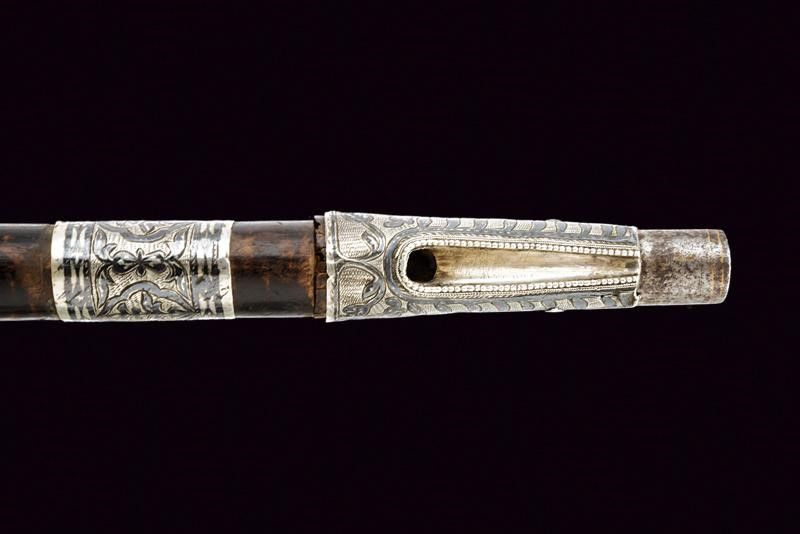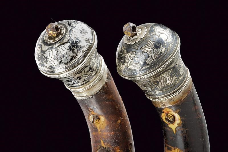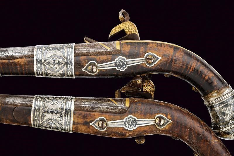 Fine XVIII inizio XIX Secolo Canne tonde lisce, munite al dorso di bindella sgusciata che termina in volata in un giglio dorato. Le culatte con intagli e incisioni floreali parzialmente rimessi in oro. Cal. 15,7 mm. in volata. Intaccature. I bellissimi codoli delle canne allungati sino a lambire la coccia e finemente ageminati in oro a motivi floreali. Belle batterie alla morlacca (una con meccanica da sbloccare), anche queste con eleganti agemine in oro a racemi (ben conservate, minime mancanze) e firmate, sempre in oro a caratteri arabi sulla faccia inferiore della molla. Casse lunghe in legno, una in condizioni migliori, l'altra con piccoli danni e segni del tempo, quella ben conservata con resti di finitura ebanizzata. Grilletti a sfera en suite con le batterie. Alcune tarsie in osso ancora presenti, altre mancanti. Bei fornimenti in argento, incisi a motivi floreali e niellati. Una pistola mancante di una fascetta e del bocchino. Prive anche di bacchette. Coppia di gran qualità che merita assolutamente un adeguato restauro.