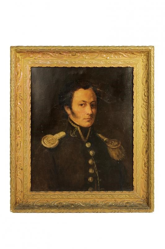 dimensioni 45.5 x 65 cm. Prima metà del XIX Secolo Ritratto di un ufficiale di marina in uniforme nera, con colletto alto decorato ad ancore e con gallone, spalline e bottoni dorati. In bella cornice dorata e decorata a motivi floreali in bassorilievo.