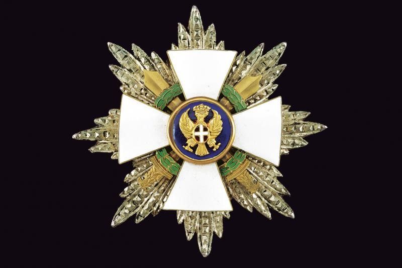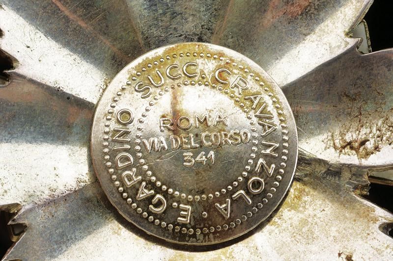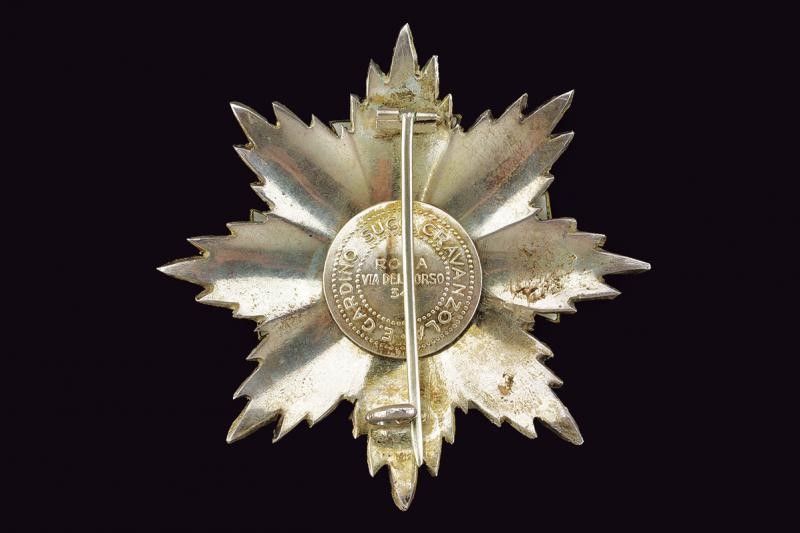 1942 - 1945 Stella da grand'ufficiale con spade, in argento; smaltata e dorata al centro. Spilla verticale. Con marcatura di Gardino/Roma.