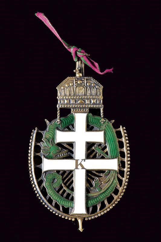 1918 Bellissimo esemplare di questo raro ordine privo di classi. In argento, con resti di doratura e smalti, il retro finemente inciso con doppia croce e drago; lungo passante per il nastro da collo.