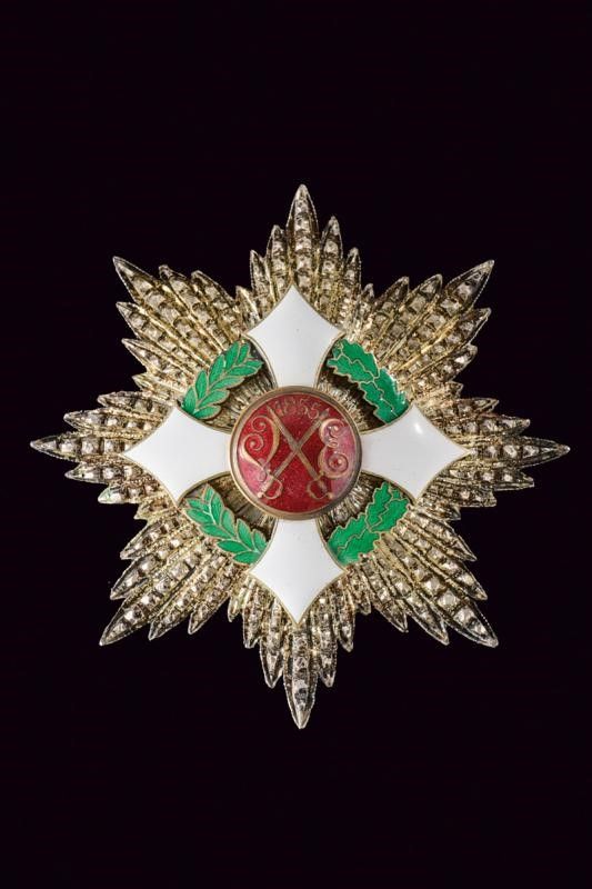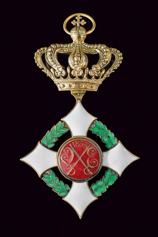 dimensioni 5.3 x 9 - 8.1 x 8.2 cm. Terzo quarto del XX Secolo Set di gran croce con pendente in metallo dorato e smaltato sotto corona; la stella in argento e smaltata al centro, al retro spilla verticale e marcatura 'E. GARDINO SUCC. GRAVANZOLA ROMA VIA DEL CORSO 341'.