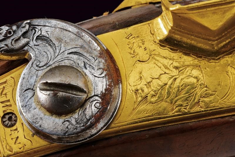 Canne lisce, con base quadra leggermente intagliata e con bindella, su una delle due bindelle si intravedono ancora i resti di una firma 'CAS'; zone con danni da ruggine, cal. 15 mm. Codette con traguardo in ottone dorato. Batterie a pietra focaia con cartella in bronzo dorato al mercurio, incise con una figura seduta, disegni floreali e marcatura 'IN WIEN'; i cani in ferro intagliato, con testa di drago e decori floreali. Casse intere in radica con bellissimi fornimenti di tipica foggia Viennese, in bronzo dorato al mercurio; la contropiastra con due personaggi e trofei (parzialmente traforati), i ponticelli con trofeo, i fornimenti restanti decorati a motivi floreali (una delle cocce con crepa)). Al dorso uno scudetto con busto fra due putti su aquila con mascherone. Bacchetta in legno con battipalla in corno e cavastracci in ferro.