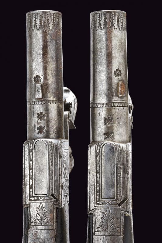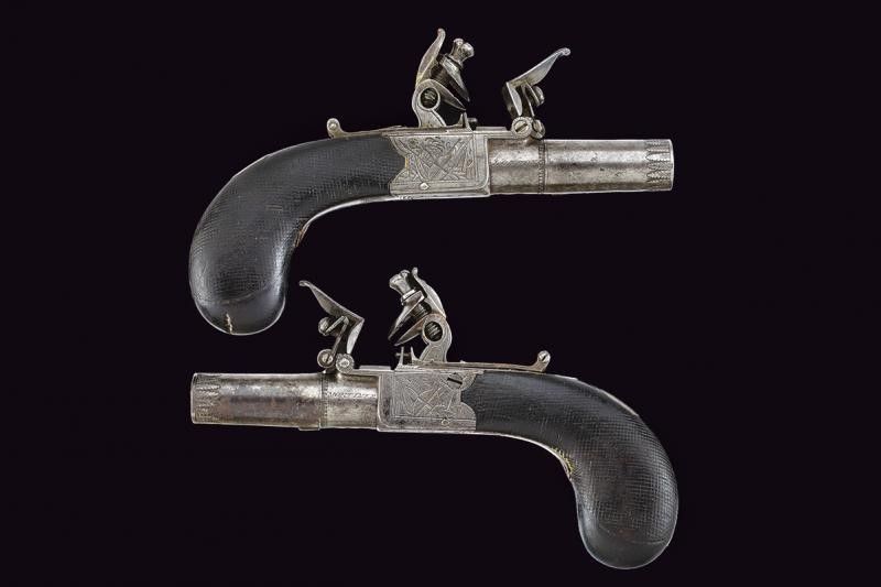 lunghezza 12 cm. Canne lisce, tonde, svitabili, incise alla volata e con punzone del banco di prova di Birmingham, cal. 8 mm . Castelli del tipo box-lock finemente incisi a trofei, sui lati 'MORTIMER / LONDON'. Cani dorsali, con sicura. Grilletti a scomparsa. Calci in legno con resti di zigrinatura, i dorsi con scudetto in argento.