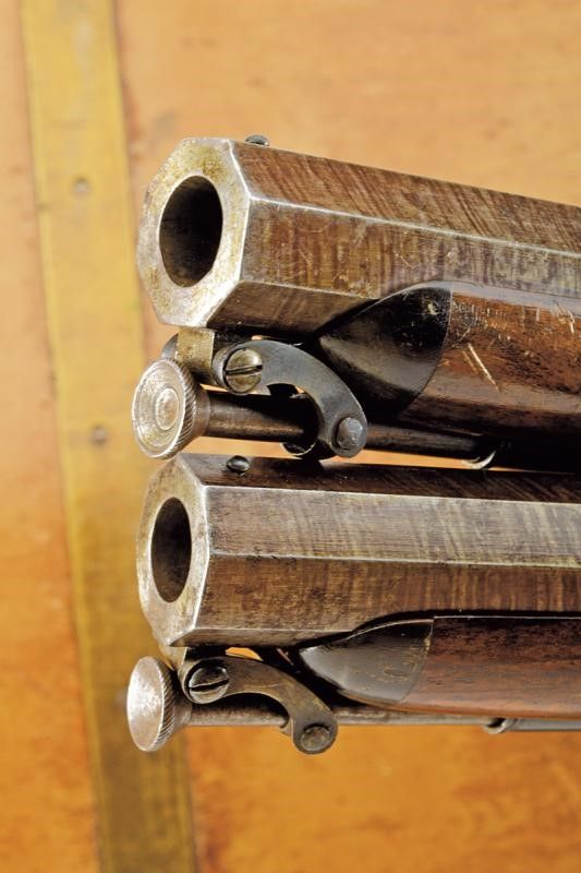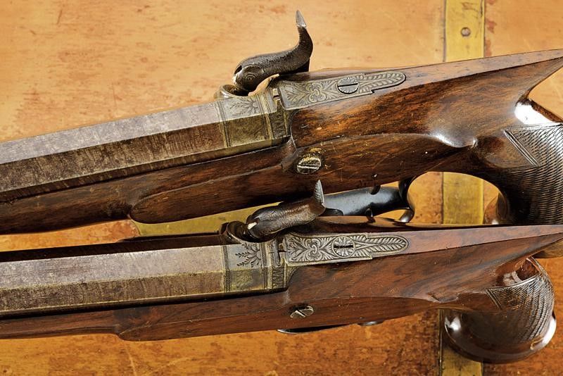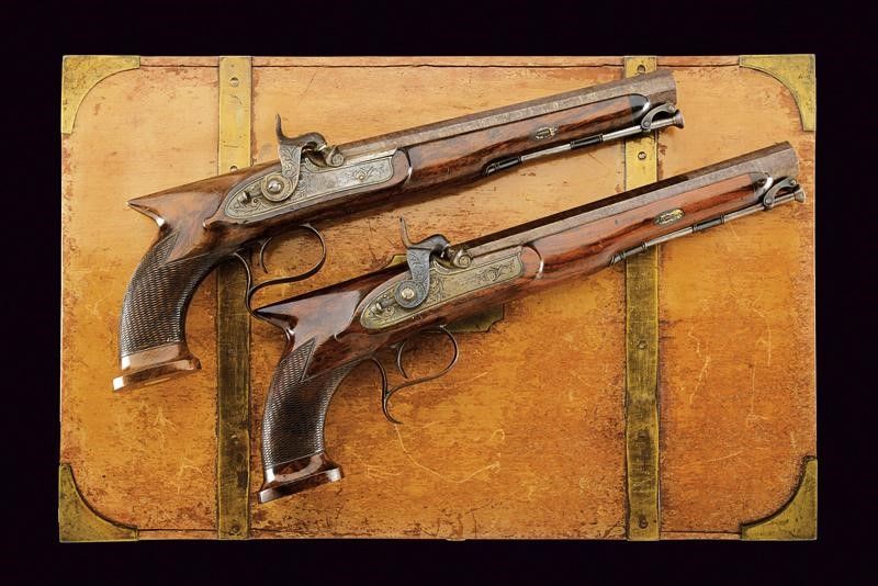 lunghezza 40 cm. Canne lisce, ottagonali, brunite, con culatta incisa a motivi floreali, marcate con punzone del banco di prova di Birmingham, dotate di mirino, cal. 13 mm. Codette finemente incise e munite di alzo. Batterie a luminello a molla in avanti firmate 'Moore', incise a motivi floreali e munite di sicura. Casse intere in legno con calcio a manico di sega zigrinato. Cocce piatte. Ponticelli incisi e bruniti, muniti di poggiadito. Bacchette in ferro a snodo. In una cassetta di epoca successiva con diversi attrezzi e una bella fiasca a tre scompartimenti.