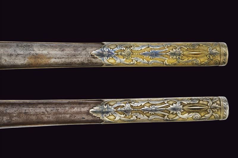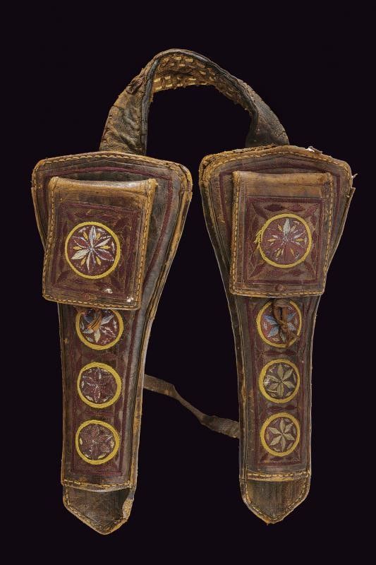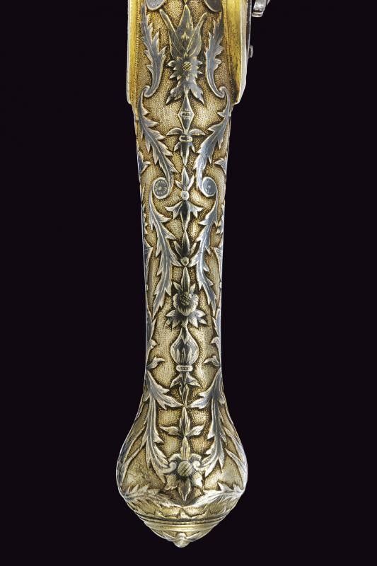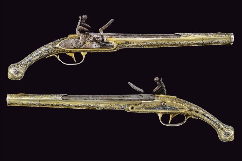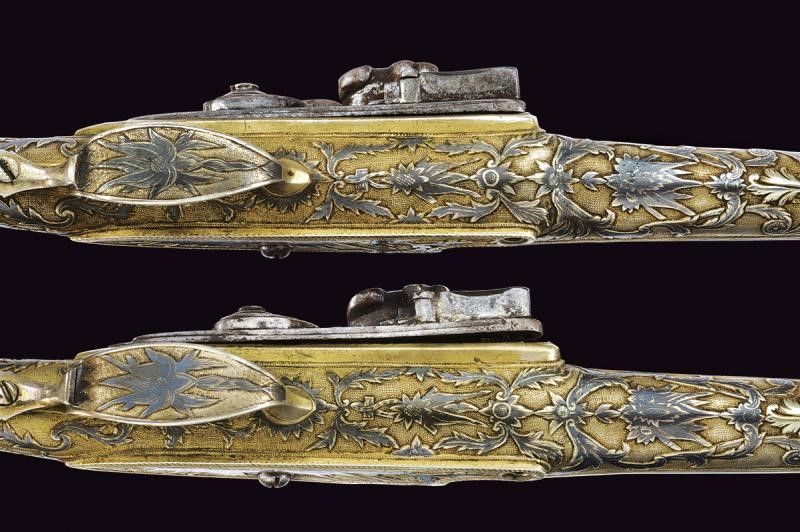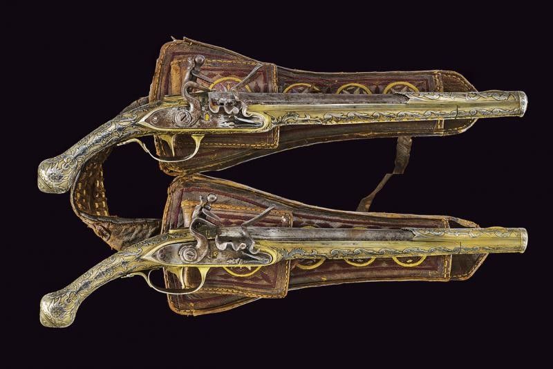 lunghezza 48 cm. XIX Secolo Canne tonde in ferro, cal. 16,2 mm. in volata. Resti di incisioni a palmette al dorso. Una canna con copertura del codolo mancante, l'altra con traguardo a sella dorato e lamina con resti di niellatura. Batterie a pietra alla madrilena, aventi cartella recante resti di un punzone rimesso in oro. Le meccaniche da rivedere (in entrambi i casi il cane non tiene la seconda posizione di monta). Casse intere in vermeil riccamente ornate con fioarmi e vasi in rilievo su fondo puntinato; gli elementi rilevati recanti anche disegni a niello. Tipico disegno con bacchetta 'finta' e lunghi bocchini ad incastro che completano le decorazioni della cassa. Due viti mancanti. Contropiastre con trofei niellati. Insieme in un paio di fonde da sella in cuoio (forti segni d'uso e del tempo), ricamate sul lato esterno.