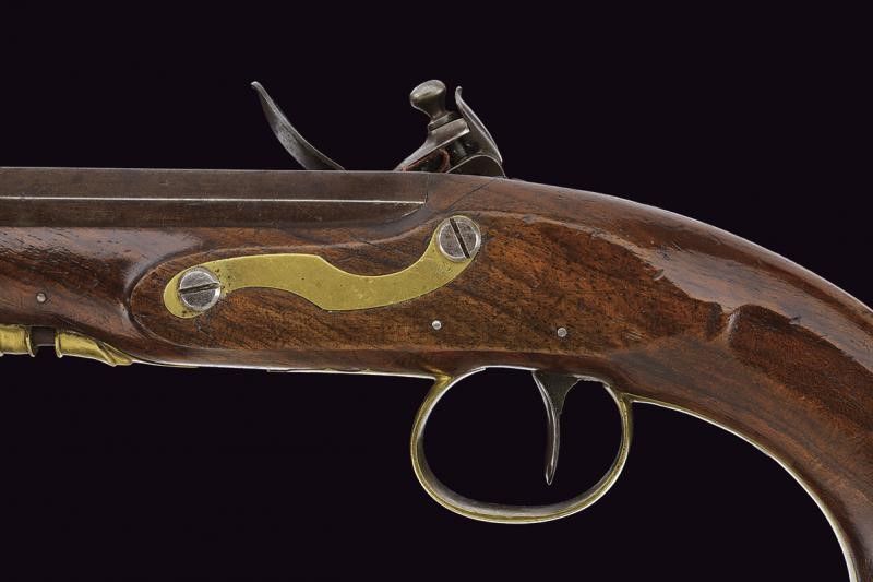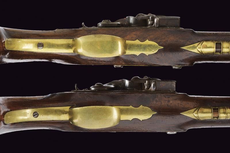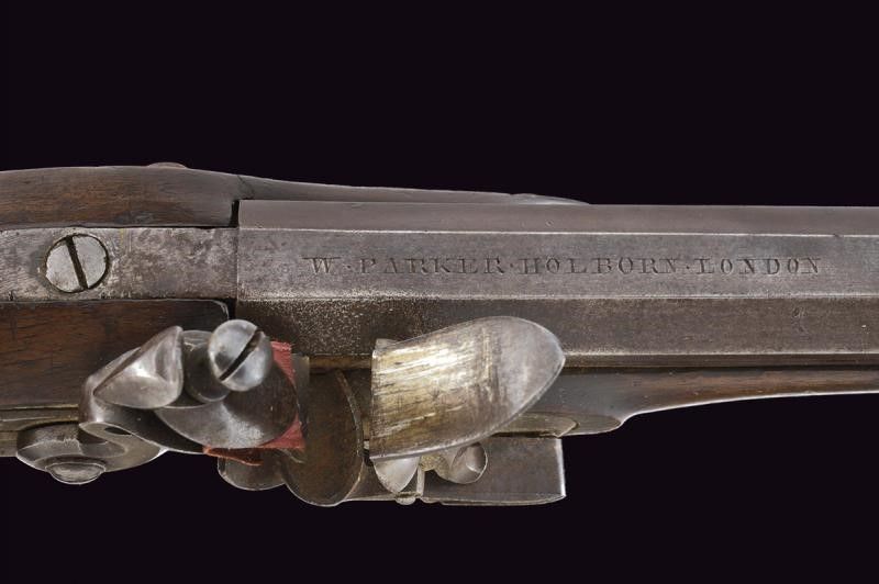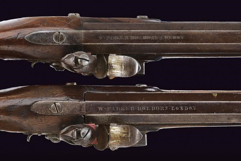 lunghezza 25 cm. Canne lisce, ottagonali firmate 'W. PARKER HOLBORN LONDON', con mirino, cal. 13 mm; batterie a pietra focaia firmate 'W. PARKER', con resti di brunitura, sistemi antifrizione e tenuta stagna, e dotate di sicura. Casse intere in legno, con fornimenti in ottone e bacchette in legno con battipalla in ottone.