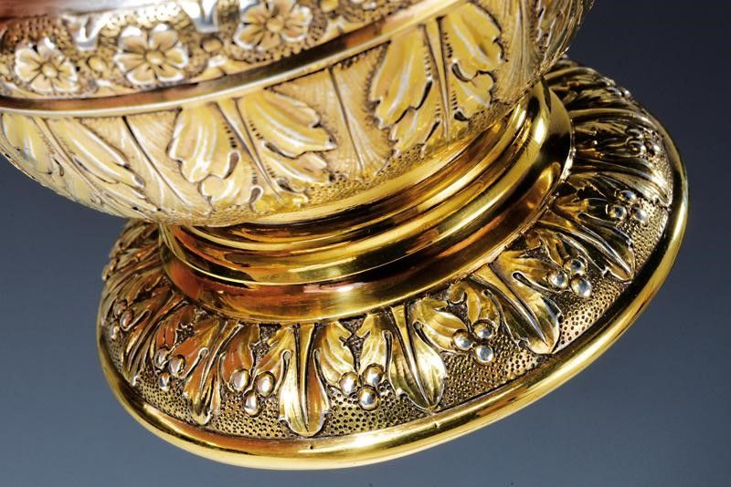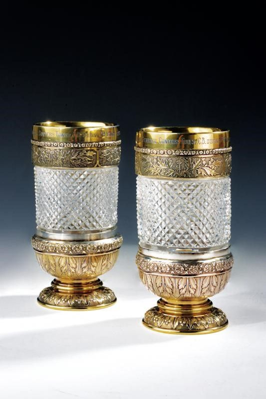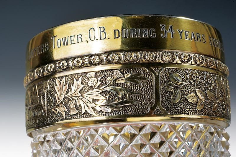 altezza 14.5 cm. 1878 Di struttura in vetro (venatura in un calice) con superficie esterna lavorata a piccole piramidi rilevate; bei fornimenti in argento dorato finemente intagliati a motivi floreali (cardi, trifogli e rose), i bordi superiori recanti l'iscrizione 'COMPOSED OF THE LACE WORN BY MAJOR-GENERAL CONYERS TOWER , C.B. DURING 34 YEARS SERVICE IN THE ARMY. 1878.'. Diversi punzoni su tutti e tre i fornimenti e alla base marcature '514', '515' e 'X'.