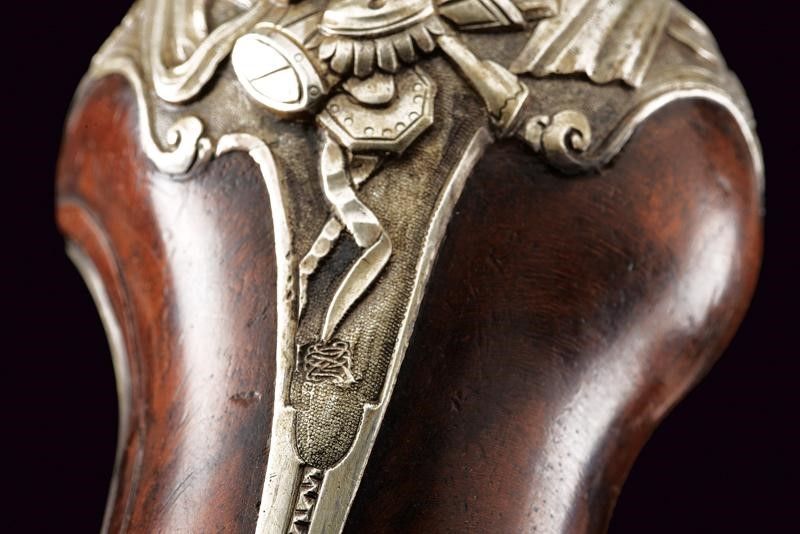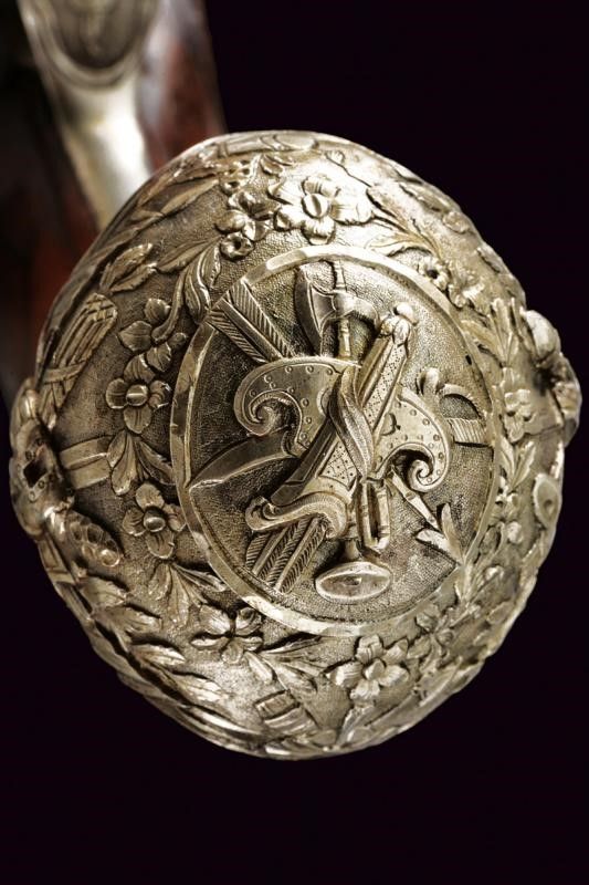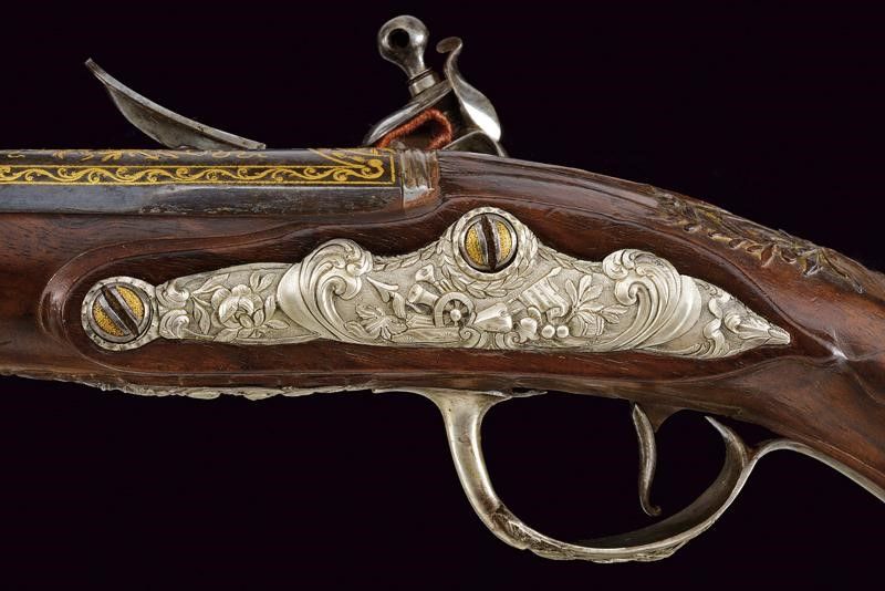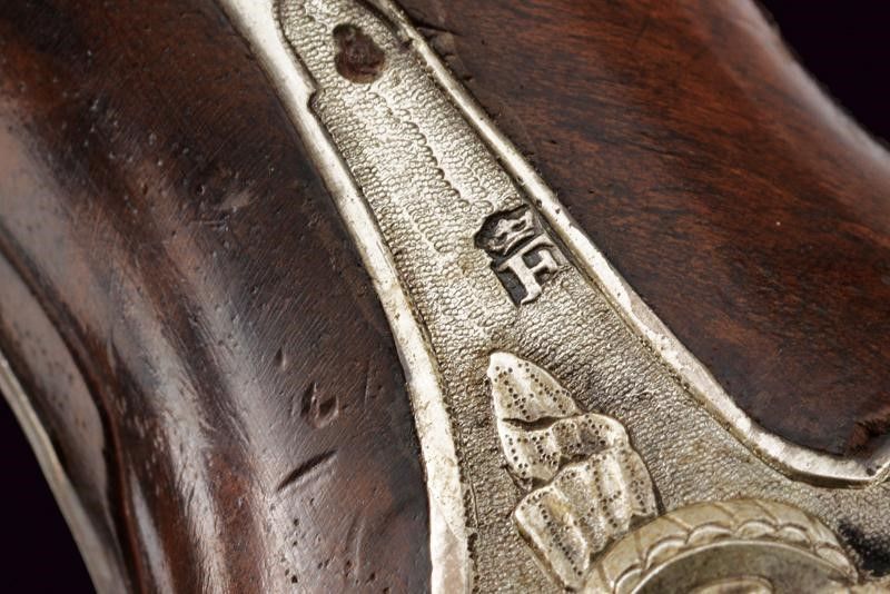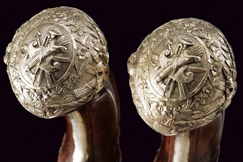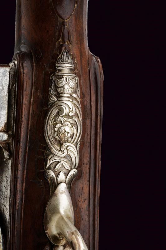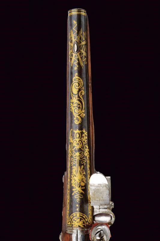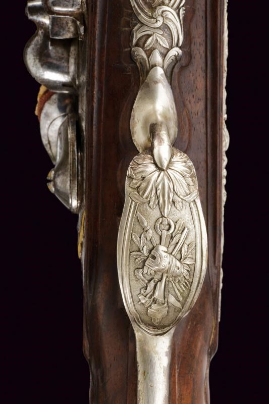 Canne lisce, tonde con base quadra e munite di anellature, recanti su tutta la lunghezza bellissime incisioni rimesse in oro giallo, con un giglio coronato, trofei, saette e decorazioni floreali su fondo brunito. I mirini in argento, cal. 16 mm. in volata. Codette incise e dotate di traguardo, recanti vite dorata. Eleganti batterie a pietra focaia a cartella tondeggiante, firmate 'Peyret Dumarest a St. Etienne', con codetta ribassata, e ornate con intagli e dorature; gli scodellini a tenuta stagna, la vite dei cani dorata. Casse intere in legno con intagli floreali attorno alla codetta. Fantastici fornimenti in argento riccamente decorati a trofei e a motivi floreali in rilievo, recanti vari punzoni; i dorsi con scudetto recante una mezzaluna fra raggi. Bacchette in corno con battipalla in argento dorato e cavastracci in ferro.