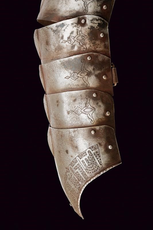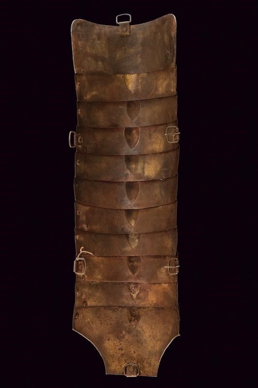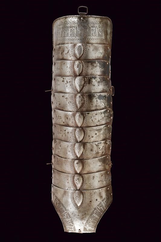 lunghezza 68.7 cm. XIX Secolo Guardacollo costituito da undici lame in ferro, rivettate. Le estremità incise con bande recanti iscrizioni in caratteri arabi. Le lame recanti al centro uno sbalzo a forma di goccia e incisioni floreali e geometriche. Sei fibbie per il fissaggio. Raro ed interessante.