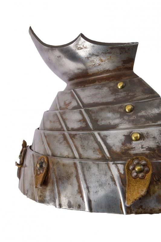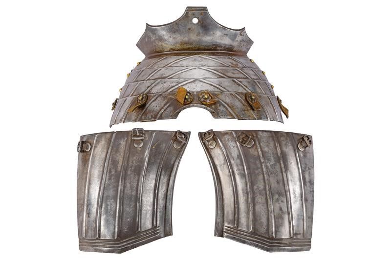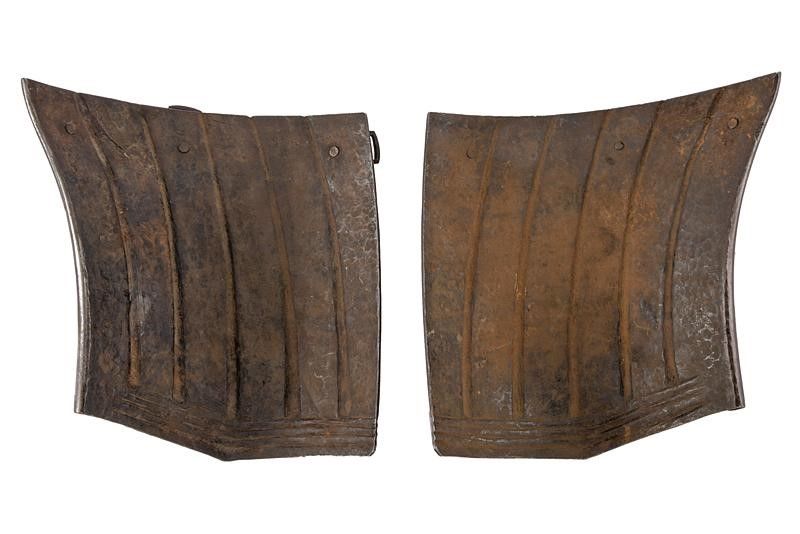 dimensioni various cm. In robuste lame di ferro decorato. Panziera per un petto tondo con quattro lame di falda decorate a nervature oblique. L'ultima lama con rosette e resti di coietti per fissare le scarselle (42 x 23 cm). Insieme con un paio di scarselle lavorate in un solo pezzo, con nervature oblique, i bordi interni con forte rialzo, il margine inferiore con triplice scanalatura. Su quello superiore tre fibbie per il montaggio (26.5 x 28.5 cm). Elementi molto rari.