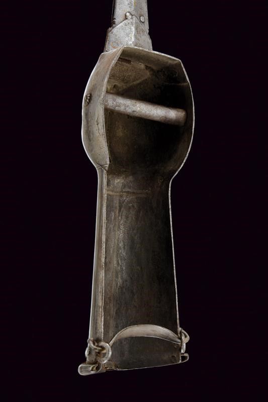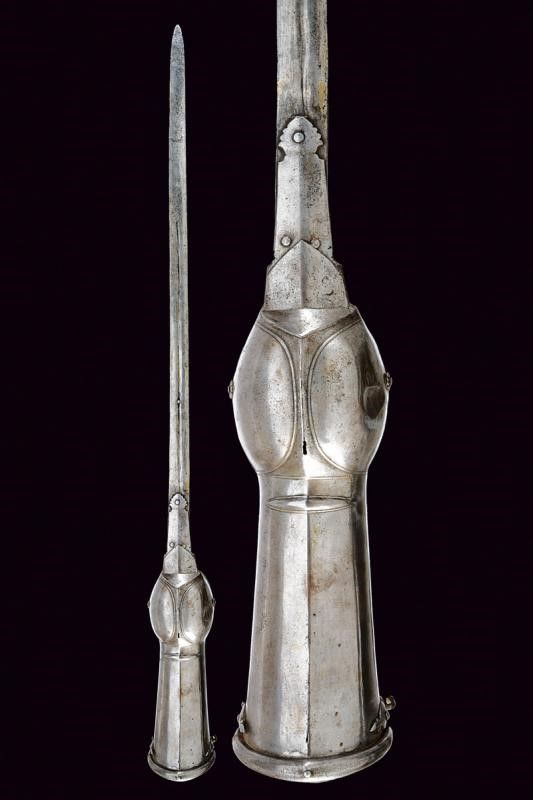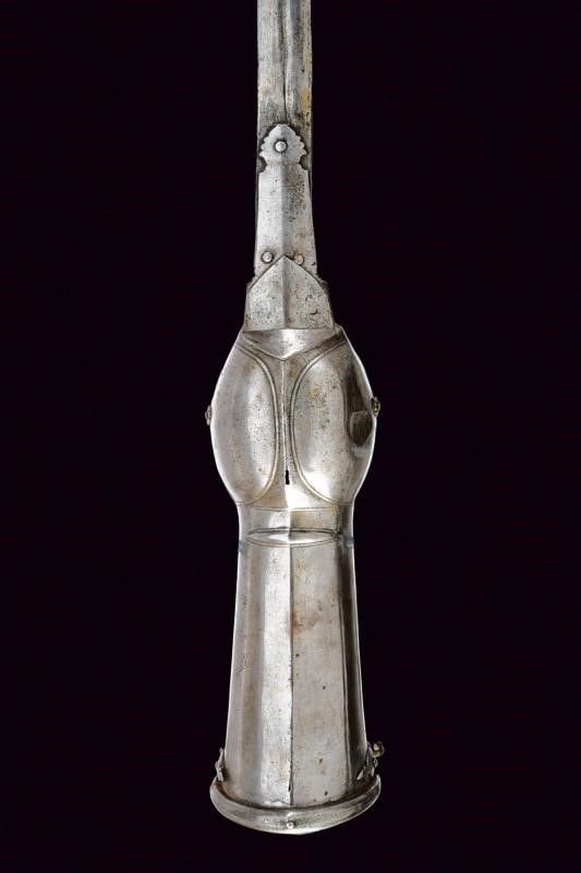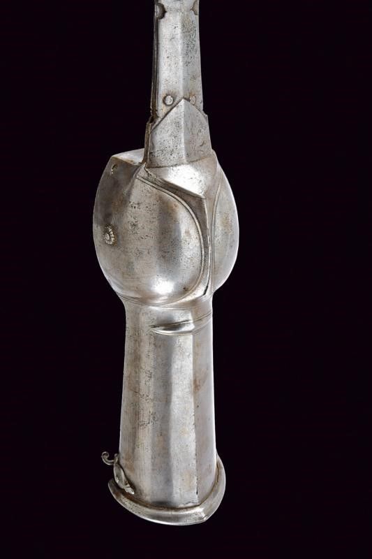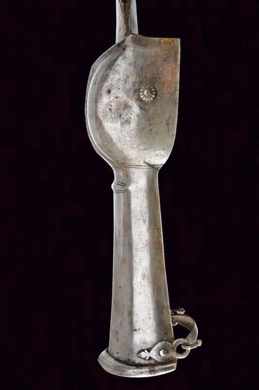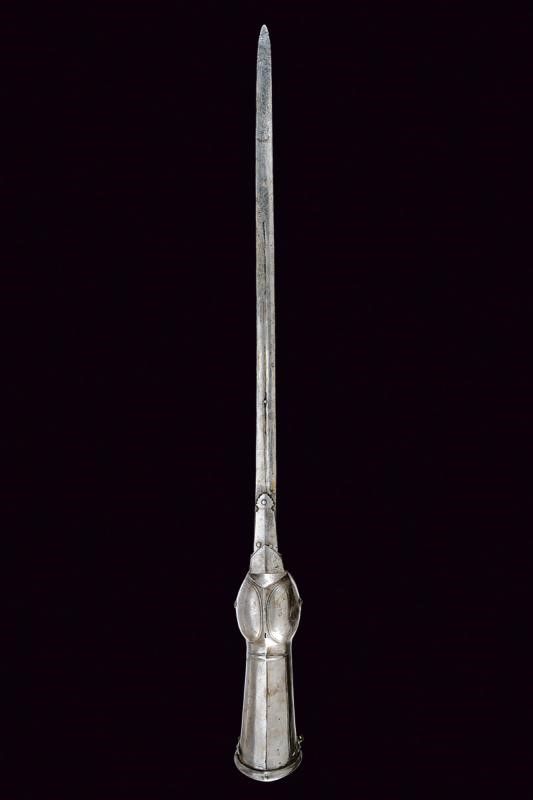 lunghezza 126.5 cm. XVIII Secolo Lunga lama dritta a due fili con scanalatura centrale (probabilmente di fattura Italiana), dotata alla base di lunghe ali di ritenzione della lama, una incompleta. Tipico fornimento in ferro, con manopola e bracciale protettivo in un unico pezzo (alcuni bozzi e difetti), i ribattini della manopola decorati con rosette in ferro.
