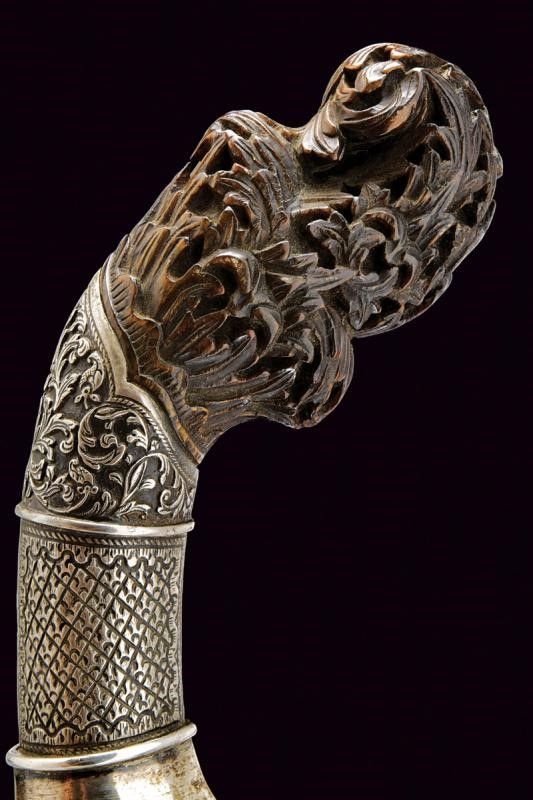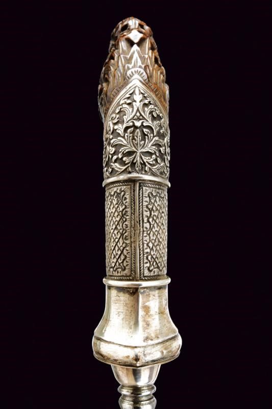 Sumatra, lunghezza 71 cm. Fine del XIX Secolo Robusta lama dritta a un filo e controfilo leggermente crescente verso il debole, la base con nodo a disco. Fornimento con pomo in corno finemente intagliato e traforato a motivi floreali, l'impugnatura rivestita in lamina d'argento elegantemente sbalzata a motivi floreali su fondo scuro. Fodero in legno liscio.