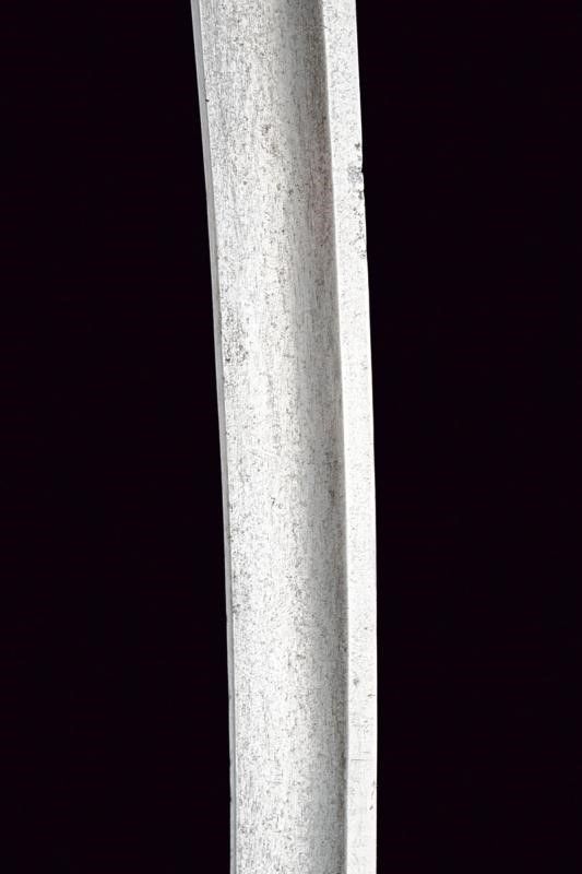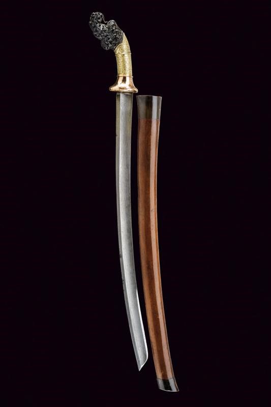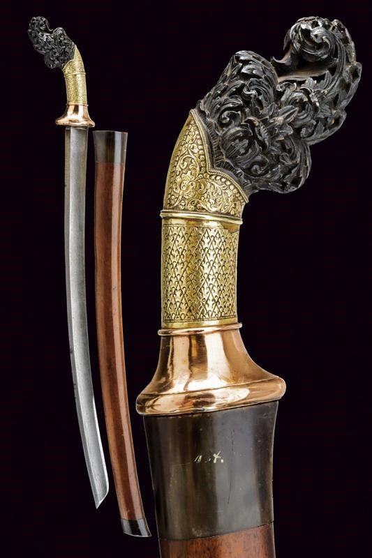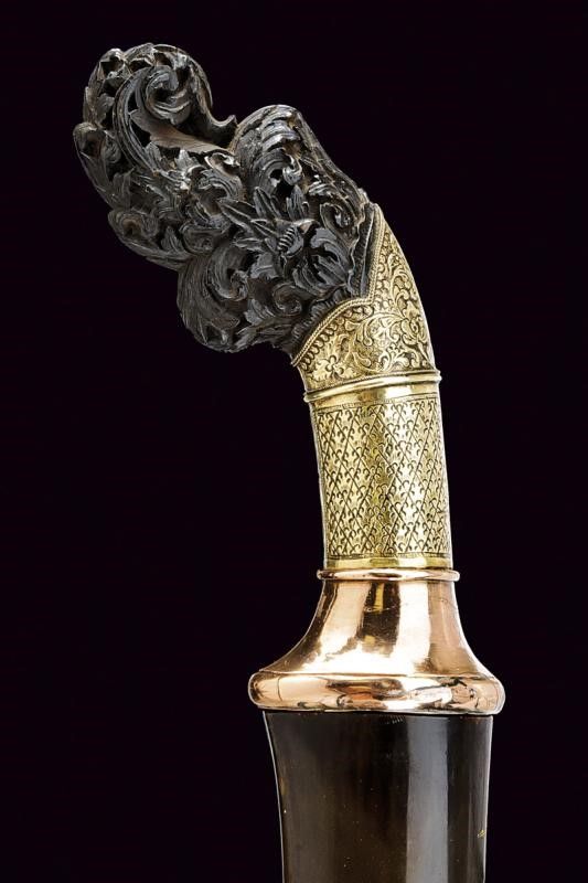 Sumatra, lunghezza 78 cm. Prima metà del XX Secolo Lama in stile europeo, curva, a un filo e controfilo, con ampio sguscio e tallone. Fornimento con pomo in legno scolpito e traforato, impugnatura rivestita in lamina di metalli diversi, parzialmente incisi e sbalzati a motivi floreali e geometrici. Fodero in legno con cappa e puntale in corno.