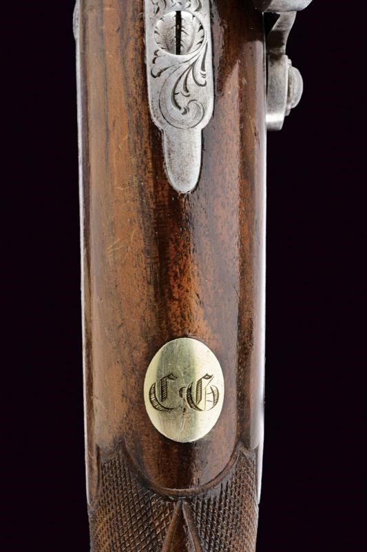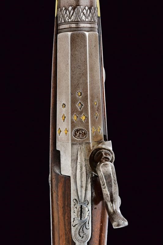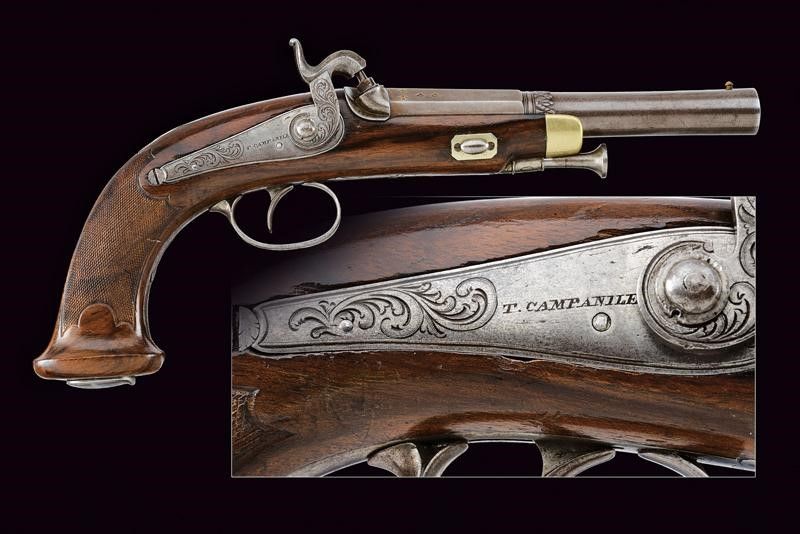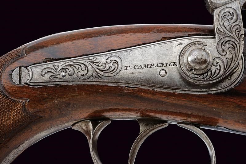 lunghezza 32 cm. Bella canna liscia a due ordini, con base ottagonale recante punzoni fra gigli e fiori con resti di doratura, dopo un anello e foglie d'acanto diviene tonda, con mirino in ottone, cal. 16 mm. Codetta incisa e munita di traguardo. Batteria a molla indietro firmata 'T. CAMPANILE' ed incisa a fiorame. Meccanica funzionante. Cassa a tre quarti in legno con calcio zigrinato. Fornimenti in ferro incisi en suite. La coccia con porta capsule. Bacchetta in ferro