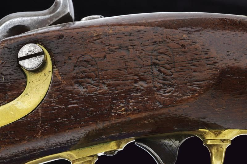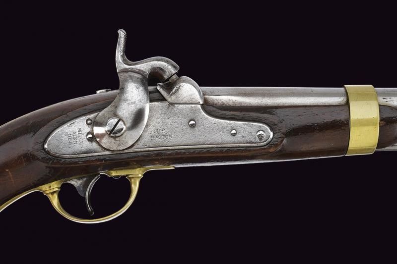USA, lunghezza 36 cm. 1850 Canna tonda liscia marcata 'JPC' e 'P', cal. 55 in volata. Anima con incrostazioni da pulire. Batteria marcata 'US H. ASTON' e con indirizzo e data 'MIDD.TN CONN. 1850'. Cassa a tre quarti in noce con timbri d'ispezione militare visibili sul lato sinistro. Fornimenti in ottone punzonati 'H'. Bacchetta in ferro a snodo.