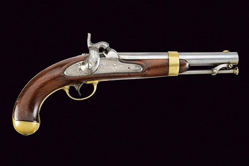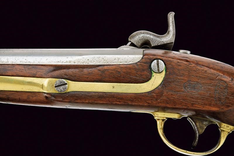 USA, lunghezza 35 cm. 1847 Canna tonda liscia marcata 'GWH', cal. 55 in volata. Intaccature e diversi segni d'uso all'interno. Batteria marcata 'US H. ASTON' e con indirizzo e data 'MIDD.TN CONN. 1847'. Cassa a tre quarti in noce con timbri d'ispezione militare visibili sul lato sinistro. Fornimenti in ottone punzonati 'H'. Bacchetta in ferro a snodo. Qualche intaccatura alle parti in ferro.